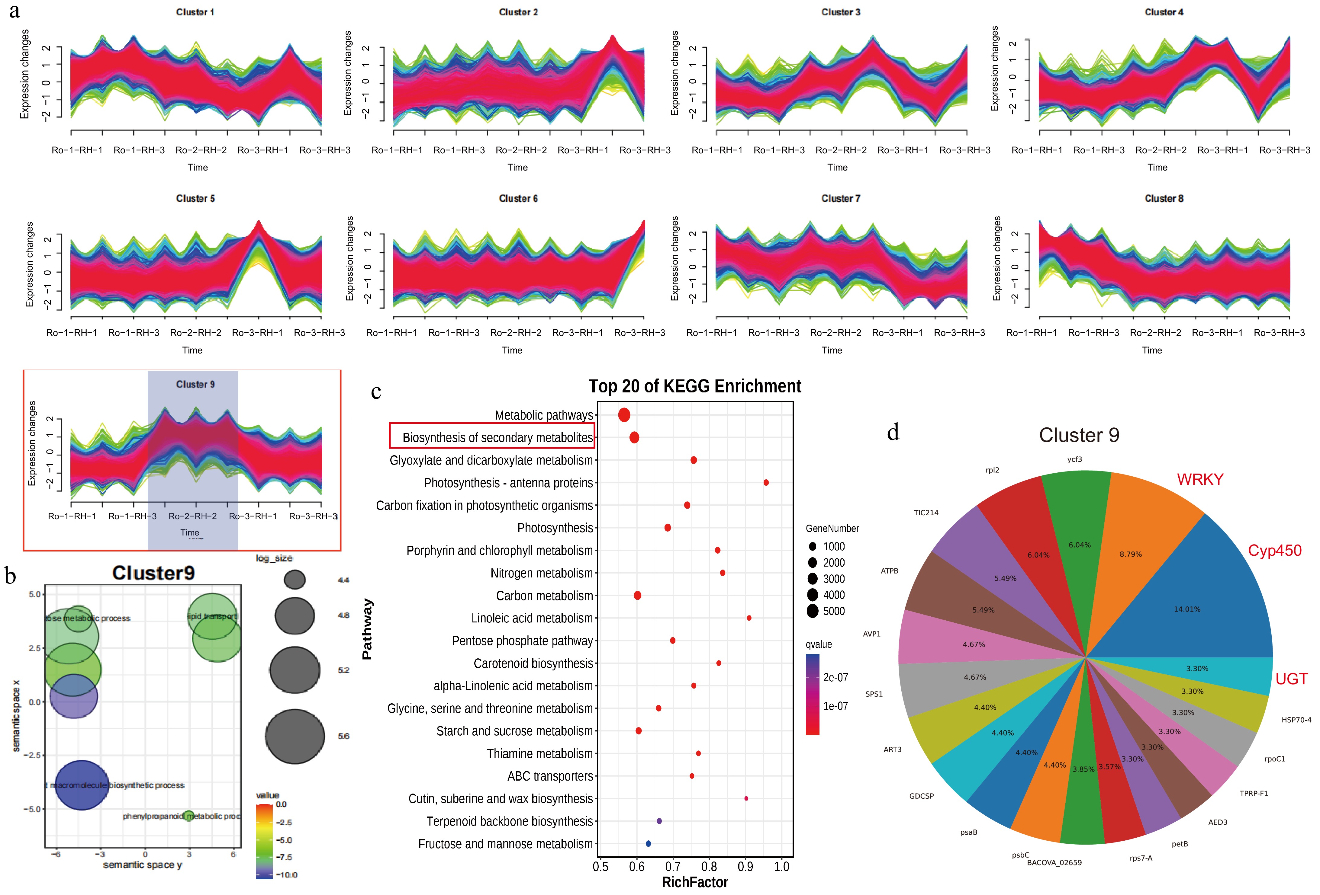 Spatiotemporal gene expression patterns of R. officinale rhizomes and functional enrichment analysis. (a) Cluster 1 to 9 showing DEGs in RO-1-RH, RO-1-RH, and RO-1-RH. (b) GO enrichment pathway analysis of DEGs from cluster 9. (c) KEGG enrichment pathway analysis of DEGs from cluster 10. (d) The gene family cluster analysis of cluster 9.