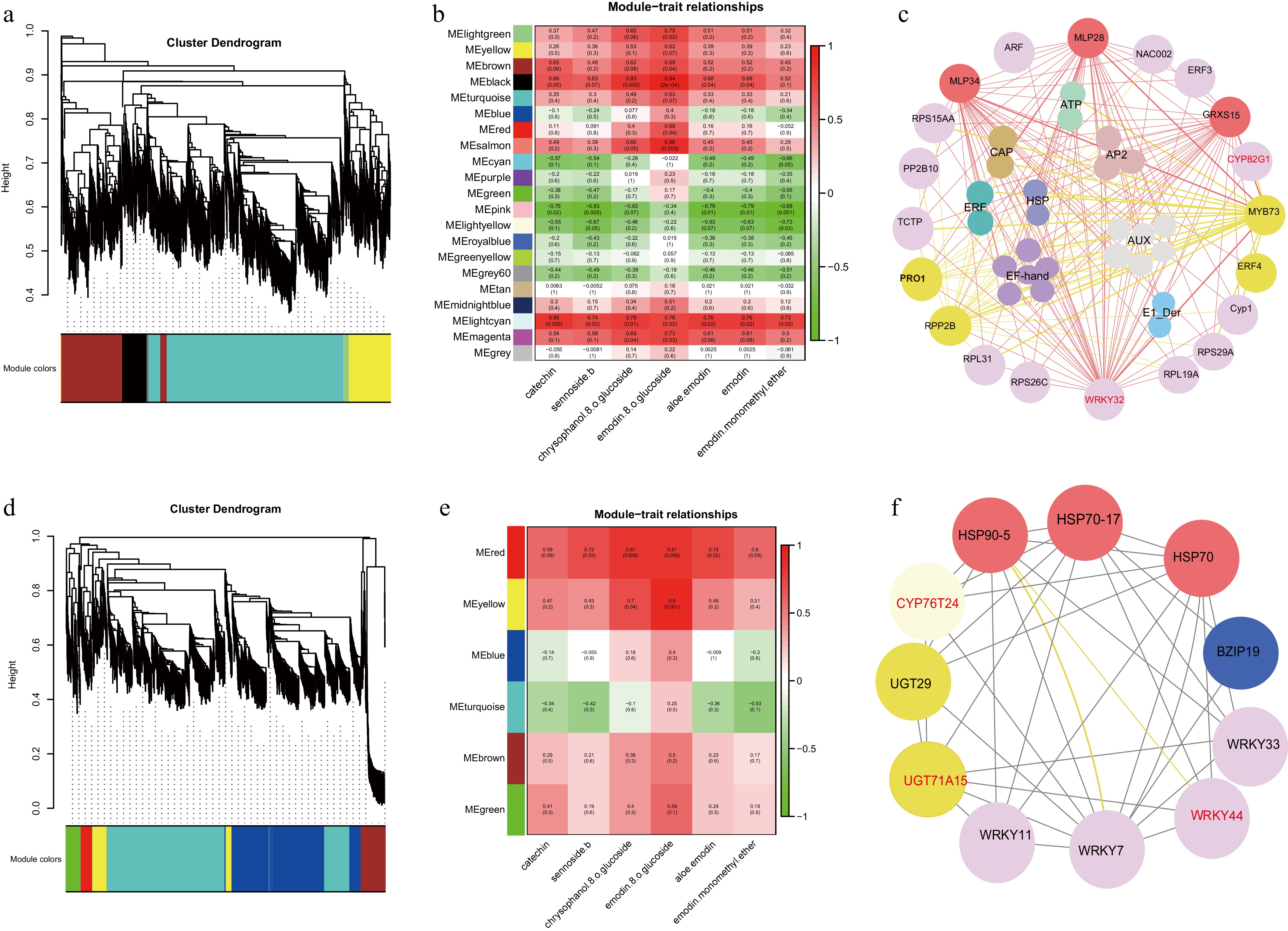 In the rhizome tissues, DEGs were categorized into six distinct modules (Fig. 7e). Among these, four modules exhibited significant correlations with key bioactive compounds, including catechin, sennoside B, chrysophanol-8-O-glucoside, emodin-8-O-glucoside, aloe-emodin, and emodin monomethyl ether. These compounds were associated with the red, yellow, brown, and green gene modules (Fig. 7e). Subsequently, 11 hub genes were identified across the light green, yellow, brown, black, turquoise, light cyan, and magenta gene modules, emphasizing their crucial roles in regulating rhizome development and metabolite biosynthesis. Further network analysis unveiled the strong connectivity of CYP76T24, UGT71A15, and WRKY44 with other hub genes, underscoring their significance as key regulators in the biosynthesis of bioactive compounds (Fig. 7f).