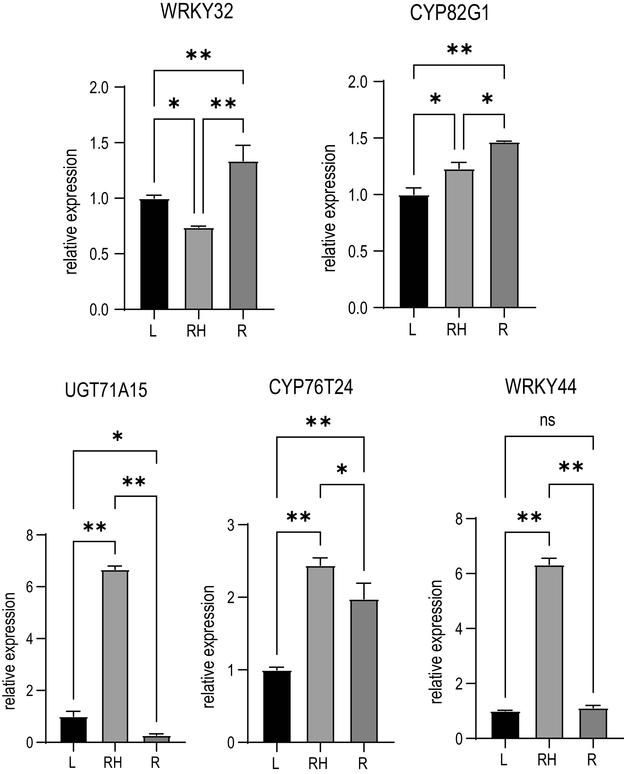 • To ensure the precision and reproducibility of the transcriptome analysis, five genes were selected for expression analysis in the leaves, rhizomes and roots of R. officinale. The results showed that CYP76T24 was highly expressed in the rhizomes and roots compared to leaves. CYP82G1 was highly expressed in the roots and rhizomes. UGT71A15 was highly expressed in the rhizomes. WRKY32 was highly expressed in roots. WRKY44 was highly expressed in the rhizomes (Fig. 8). These results indicate that these five genes are promising candidates involved in the biosynthesis of anthraquinone in R. officinale.