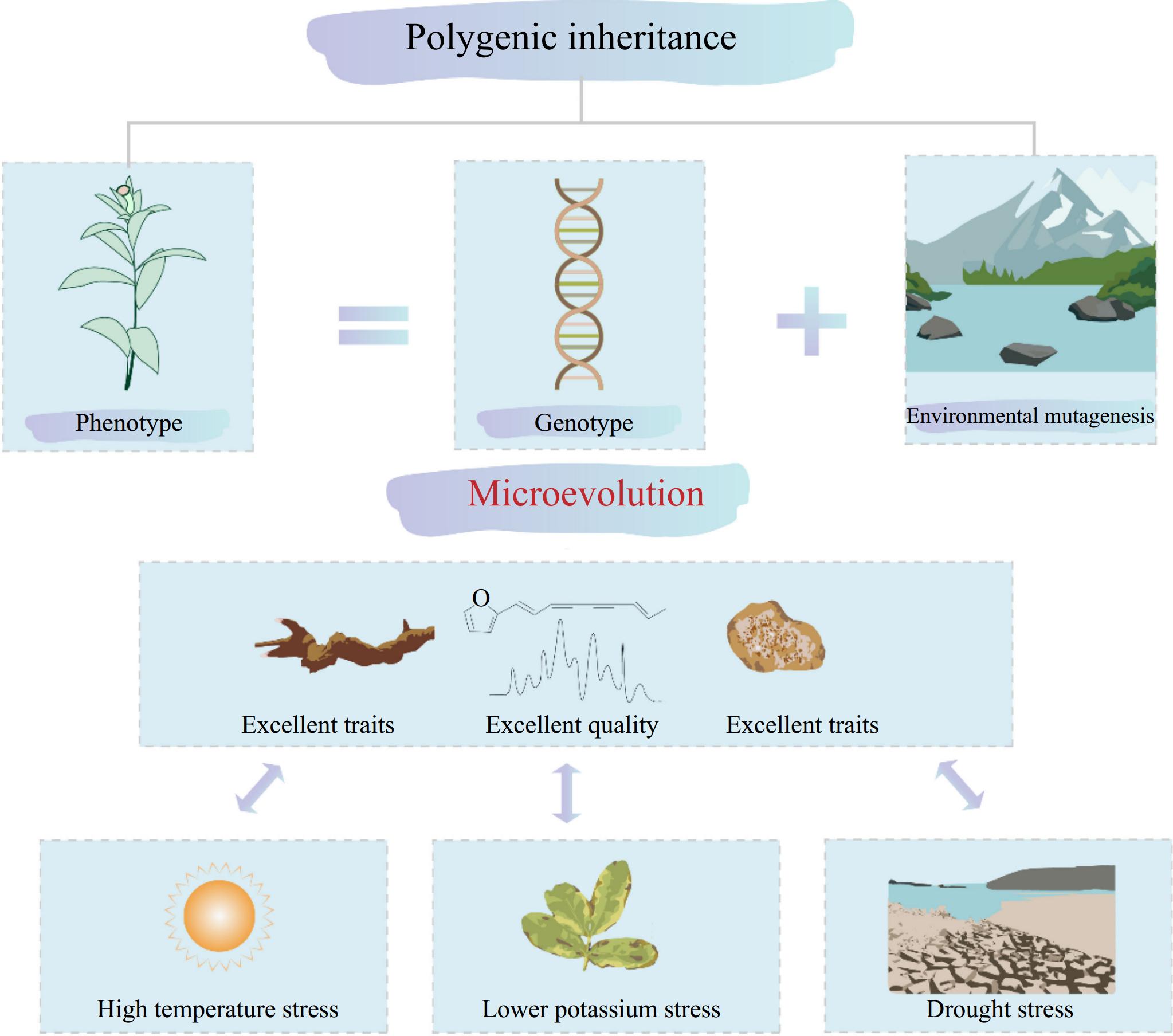 The geo-herbalism of A. lancea, characterized by its excellent traits and superior quality, represents a microevolutionary process involving multiple genes and quantitative inheritance under environmental stress. This microevolution under environmental stress manifests as adaptation and variation at both the population and individual (cellular) levels. The adaptation mechanisms involve a wide array of processes, including physiological and biochemical effects of organisms, signal transduction and its network interaction, functional gene expression and regulation, environmental stress memory, and phenotypic trait adaptation, presenting complex systemic suitability characteristics[36]. In addition, key components such as atractylodin and atractylone, along with their ratios to other volatile oil constituents, play significant roles in defining the authenticity of A. lancea. Dao-di herbs of A. lancea are subjected to various environmental stresses, including high temperatures, low light conditions, and pathogens like Fusarium oxysporum. Under moderate stress conditions, these environmental factors drive an increase in the production of atractylodin and atractylone extracts, underscoring the pivotal role of environmental stress as a driving force in the formation of Dao-di herbs (Fig. 2). In summary, the microevolution of A. lancea has synergistically shaped the 'unity of form and quality' characteristics of authentic Atractylodes Rhizoma through genetic variation screening, environmental adaptation regulation, and phenotypic plasticity optimization. In the future, we need to focus on multi-dimensional interaction network analysis to realize the systematic regulation of Atractylodes Rhizoma quality formation.