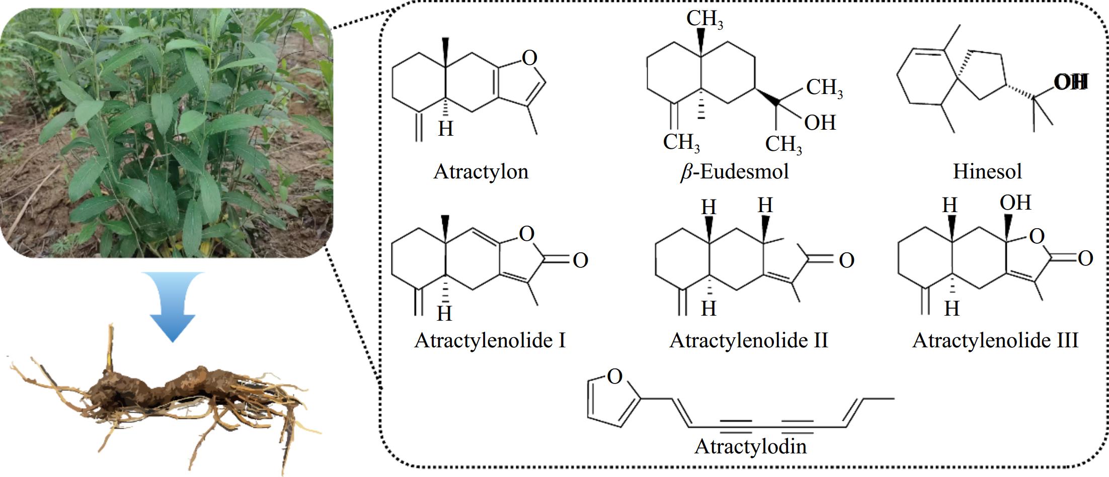 • The dried rhizomes of A. lancea (Thunb.) DC. and A. chinensis (DC.) Koidz. are categorized as "Cāng zhú", which was included in the 2020 edition of the Chinese Pharmacopoeia. Among them, Mao-A. lancea is usually regarded as the Dao-di herb with a reasonable proportion of different essential oils and good clinical efficacy[6]. The medicinal herb Atractylodis rhizoma was first documented in 'Shennong Bencao Jing', wherein it was classified as a superior-grade substance, implying its exceptional therapeutic efficacy and low toxicity. The text clearly states that 'Long-term administration of herbal decoctions facilitates bodily lightness, extends longevity, and sustains satiety without causing nutritional deprivation'. Several studies have demonstrated that sesquiterpenes and polyene compounds are the main active substances of A. lancea, especially atractylodin, atractylone, β-eudesmol, and hinesol in the rhizome, which exhibit pharmacological activities such as antiviral, anti-inflammatory, hypoglycemic, antihypoxia, hepatoprotective, and diuretic effects[79].