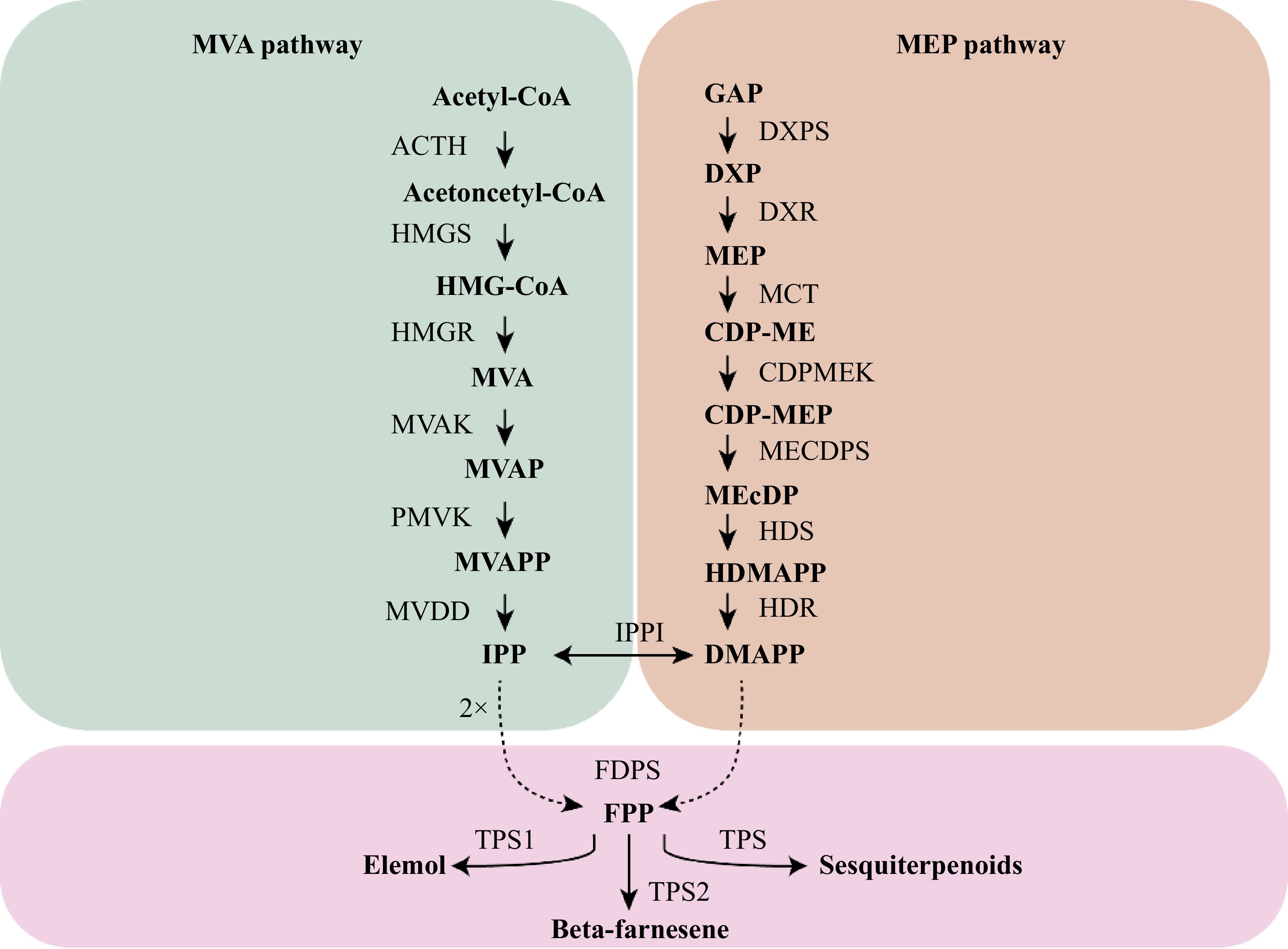 Terpenes synthesized by terpene synthase (TPS) play a crucial role in mediating plant responses to biotic and abiotic stress. Comparative genomic analysis revealed that tandem repeats have significantly expanded the TPS gene family in A. lancea[32,46]. Sesquiterpenes, known for their diverse pharmacological effects, are greatly influenced by environmental factors. The enrichment of sesquiterpenes serves as a key adaptive strategy for A. lancea and is a major contributor to its authentic formation as a Dao-di herb[47]. Previous studies have demonstrated that A. lancea populations from different regions can be classified into two chemical types based on sesquiterpene content[3,8]. These differences are regulated by key enzyme genes involved in terpenoid biosynthetic pathways[3]. Wu et al.[48] identified 42 differentially expressed genes associated with terpenoid biosynthesis in the rhizomes of two chemotypes of A. lancea. Among these, six candidate sesquiterpene synthase genes were highly expressed in the Dabieshan chemotype. Enzymatic characterization revealed that AlTPS1 catalyzes the conversion of the precursor farnesyl diphosphate (FPP) to elemol, while AlTPS2 produces β-farnesene from the same substrate[48]. The upstream genes in the terpenoid synthesis pathway are responsible for synthesizing the common precursors of secondary metabolites, whereas the downstream genes primarily determine the diversity of types and structures of secondary metabolites. The biosynthesis of sesquiterpenoids in A. lancea initiates through the mevalonate (MVA) pathway, involving specific steps such as three molecules of acetyl-CoA are condensed to form MVA, which is then phosphorylated and decarboxylated to form isoprenoid diphosphate (IPP) and its isomer dimethylallyl diphosphate (DMAPP). IPP and DMAPP are converted to farnesyl diphosphate (FPP) by farnesyl pyrophosphate synthase (FPPS), which serves as the direct precursor of sesquiterpenes (Fig. 4)[49]. Zhang et al. analyzed the seasonal patterns affecting the quality of Dao-di A. lancea and identified 13 TPS candidate genes associated with sesquiterpene biosynthesis pathways. A joint analysis of metabolic and transcriptomic data highlighted that genes involved in the MVA pathway were predominantly expressed during the growth period. In contrast, specific genes within the methylerythritol phosphate (MEP) pathway—such as AlDXS1, AlDXR1, AlCMK1, AlMDS1, AlHDS2, AlHDS3, and AlHDR1—also showed high expression during this phase. These findings suggest that highly expressed genes during the growth period provide precursors essential for sesquiterpene biosynthesis in the rhizomes of A. lancea. Further research focused on the TPS genes specific to terpenoid biosynthesis revealed 10 TPS-encoding genes that are predominantly expressed in the roots or rhizomes of A. lancea. These include AlTPS9, AlTPS17, AlTPS21, AlTPS23, AlTPS24, and AlTPS21-3. These genes are believed to directly contribute to the synthesis of sesquiterpenes accumulated in the rhizomes[50].