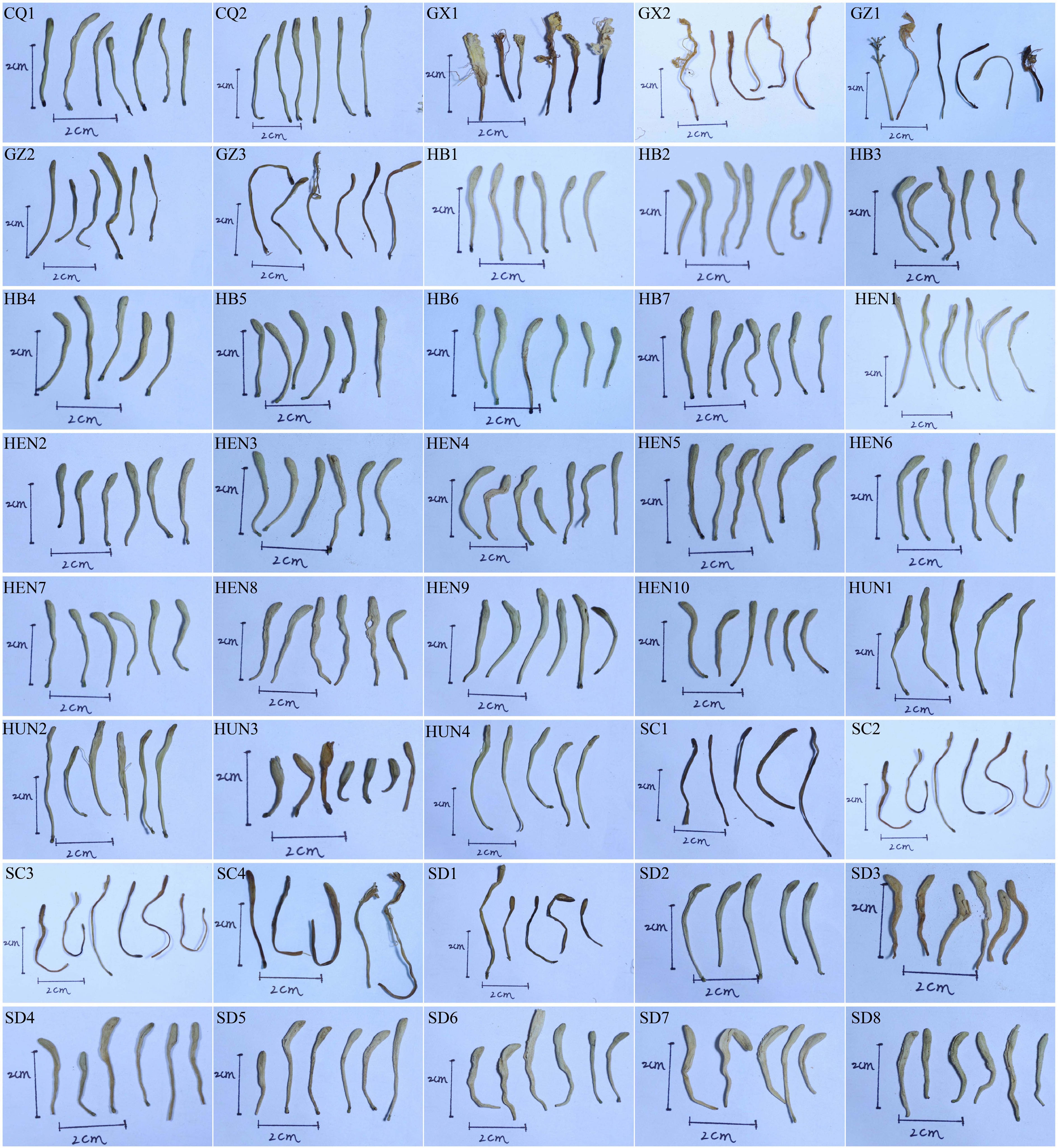 • Distinct morphological features of LJF samples were illustrated in Fig. 1 and summarized in Supplementary Table S1. There were certain differences in the morphological characteristics of samples from different regions. Samples from Guangxi, Guizhou, and Sichuan displayed slender needle-like morphologies with sparse pubescence. Sichuan samples predominantly showed brown to yellowish-brown pigmentation.