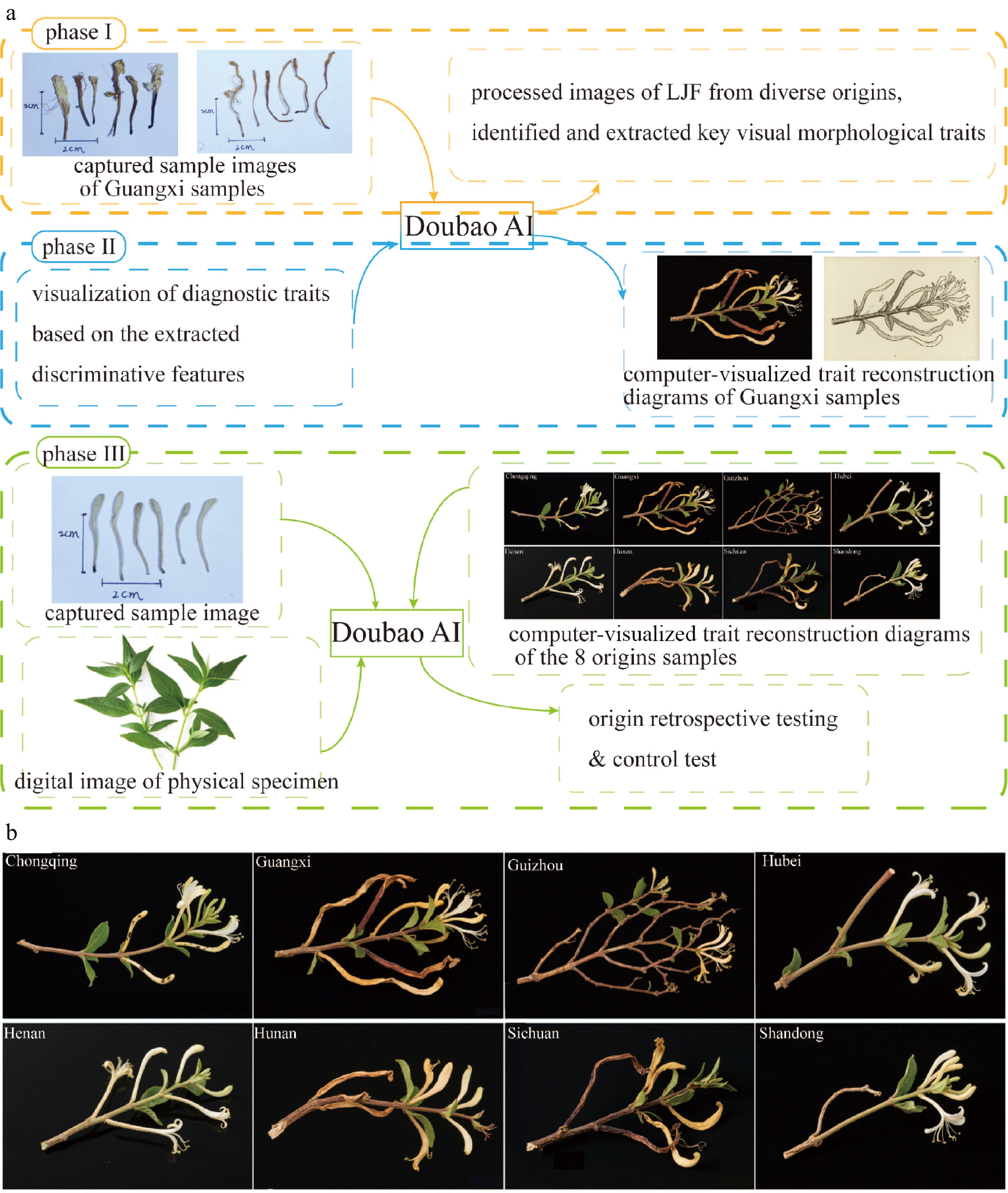 AI-assisted discrimination of Lonicerae japonicae flos geographical origins. (a) Three phases of the methodology: phase I is feature extraction and knowledge base establishment; phase II is visual trait profiling; and phase III is origin retrospection and validation. (b) Computer-visualized trait reconstruction diagrams of the eight origins samples (image generated using an AI tool [Doubao] as an auxiliary step in the methodological process).