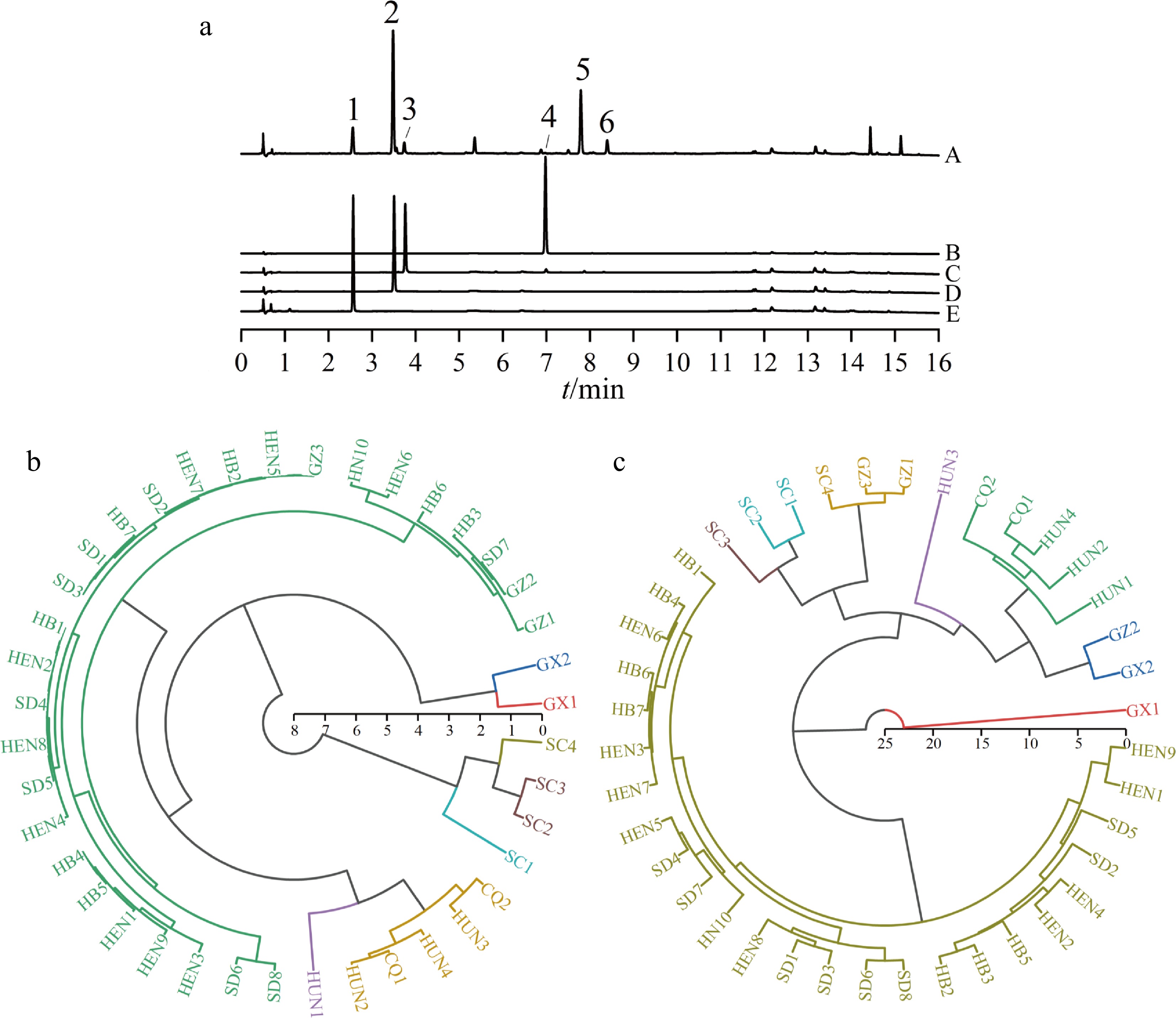 UPLC/UV chromatograms of samples and hierarchical cluster analysis of LJF from different origins. (a) UPLC/UV chromatograms of samples (A) and standard samples (B–E). Peaks 1–6 correspond to the following compounds: neochlorogenic acid; chlorogenic acid; cryptochlorogenic acid; luteoloside; 4,5-dicaffeoylepi-quinic acid and 3,5-dicaffeoylepi-quinic acid. (b) Cluster tree diagram derived based on isotopic ratios of element N. (c) Cluster tree diagram derived based on the relative contents of quality control components.