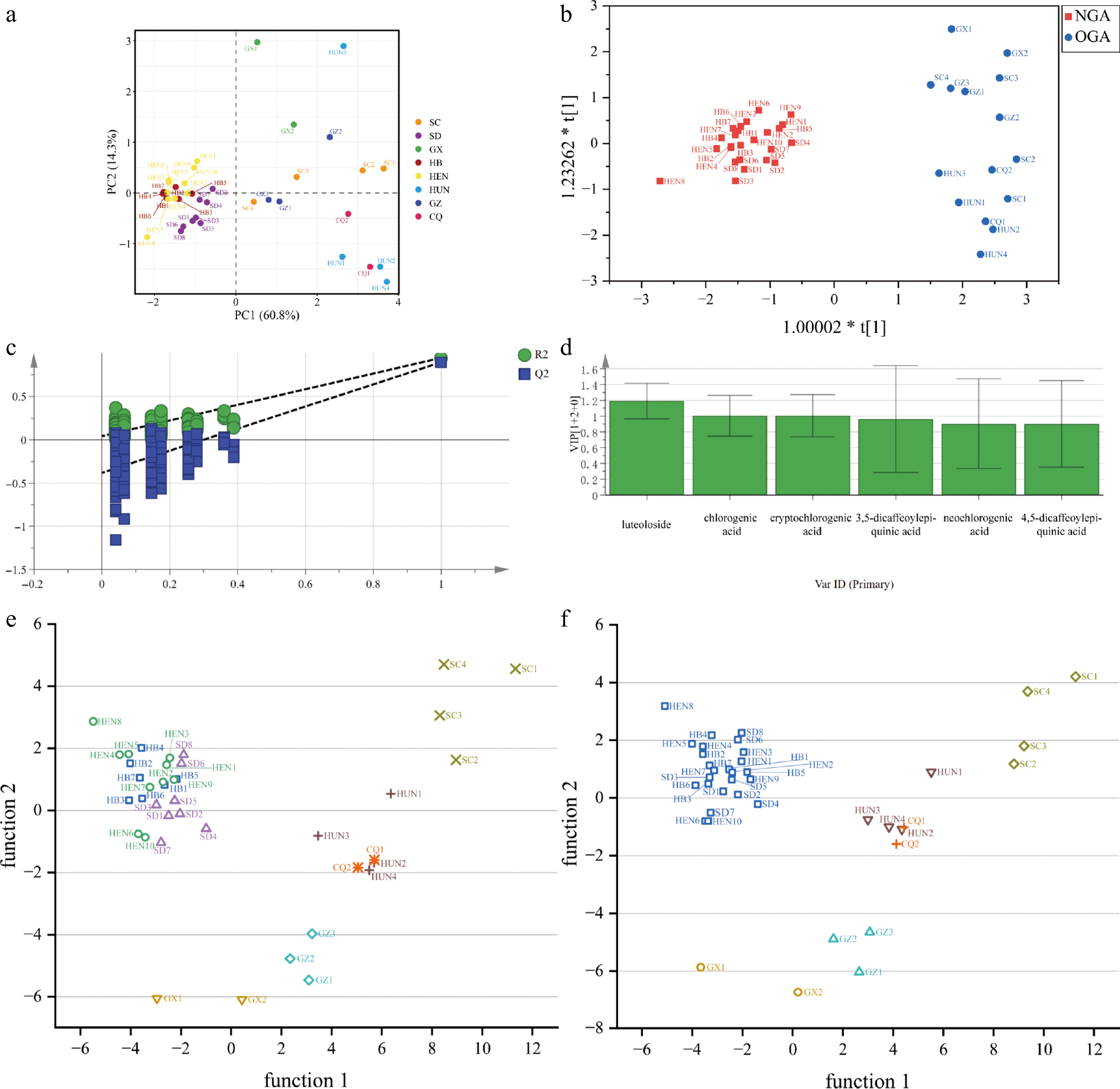 Principal component analysis, orthogonal partial least squares, discriminant analysis, and discriminant analysis scatter plot of LJF from different origins. (a) PCA score plot of LJF from different origins. (b) OPLS-DA score plot of LJF from the 'Northern Geographical Area' group (NGA) and 'Other Geographical Area' (OGA); (c) Model verification diagram of 200 permutation tests. (d) VIP value. (e) Original discriminant analysis scatter plot. (f) Optimized discriminant analysis scatter plot.