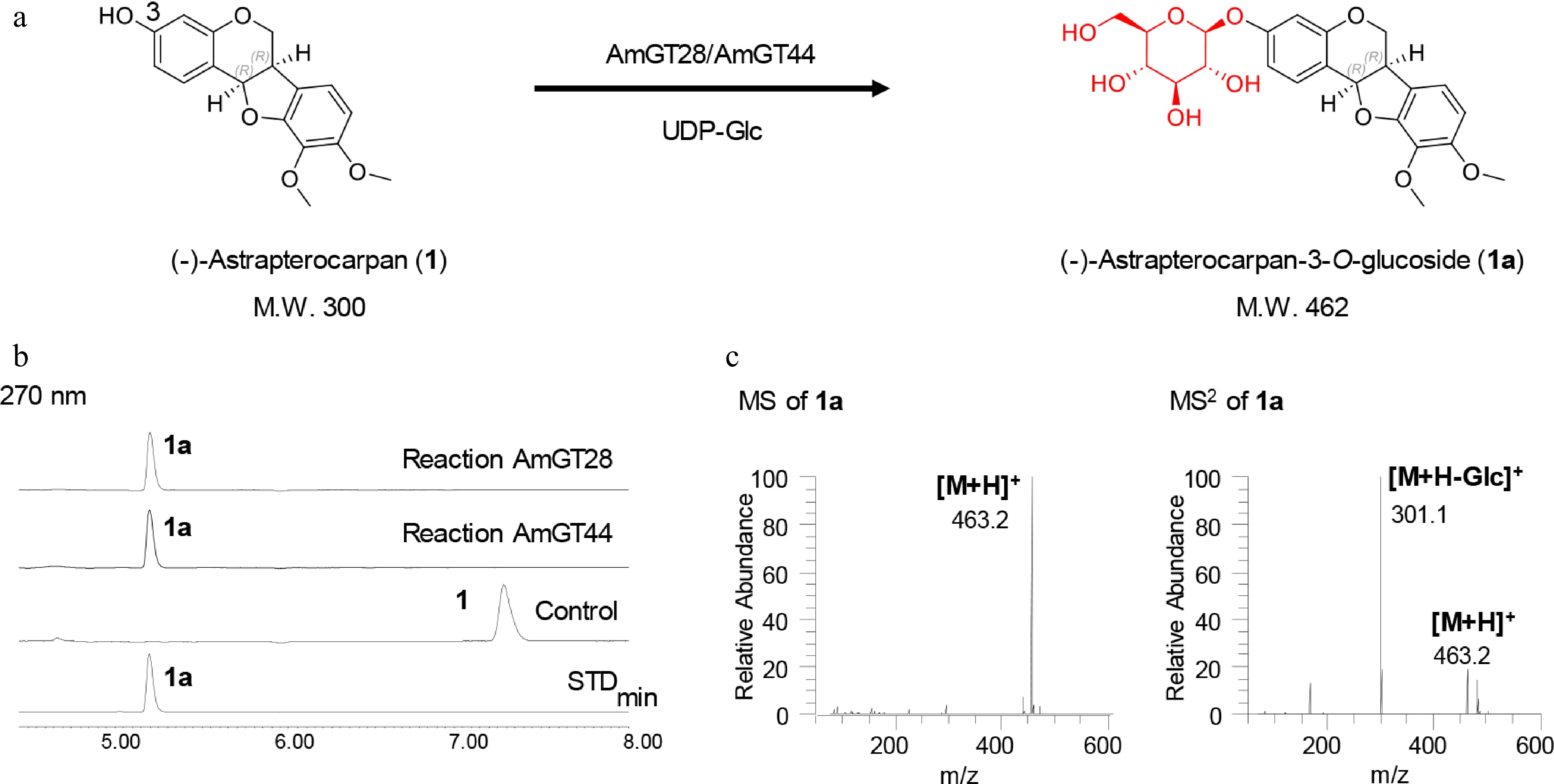 Functional characterization of AmGT28 and AmGT44. (a) Glycosylation of 1 by recombinant AmGT28/AmGT44 to produce 1a using UDP-Glc as the sugar donor. (b) UHPLC/UV chromatograms of the enzymatic reaction mixture. Control, reactions conducted using boiled protein; STD, reference standard. (c) MS and MS/MS spectra of 1a in the positive ion mode from the reaction catalyzed by AmGT28.