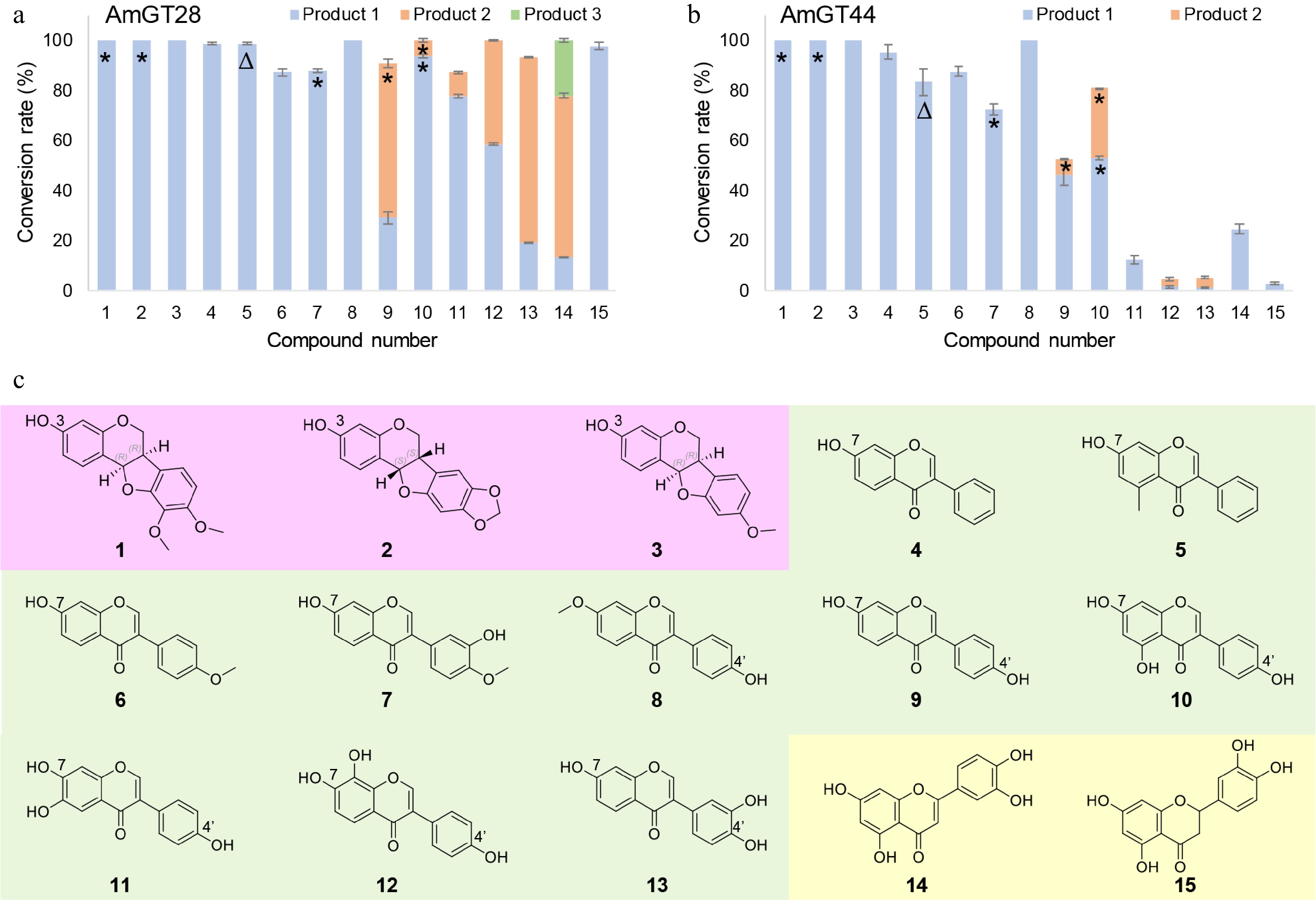 Substrate specificity of AmGT28 and AmGT44. (a), (b) Conversion rates (%) of glycosylated products for substrates 115, using UDP-Glc as the sugar donor (n = 3). *, Products identified by comparing with reference standards; Δ, product purified from scaled-up reactions and characterized by NMR. (c) Structures of substrates 115.
