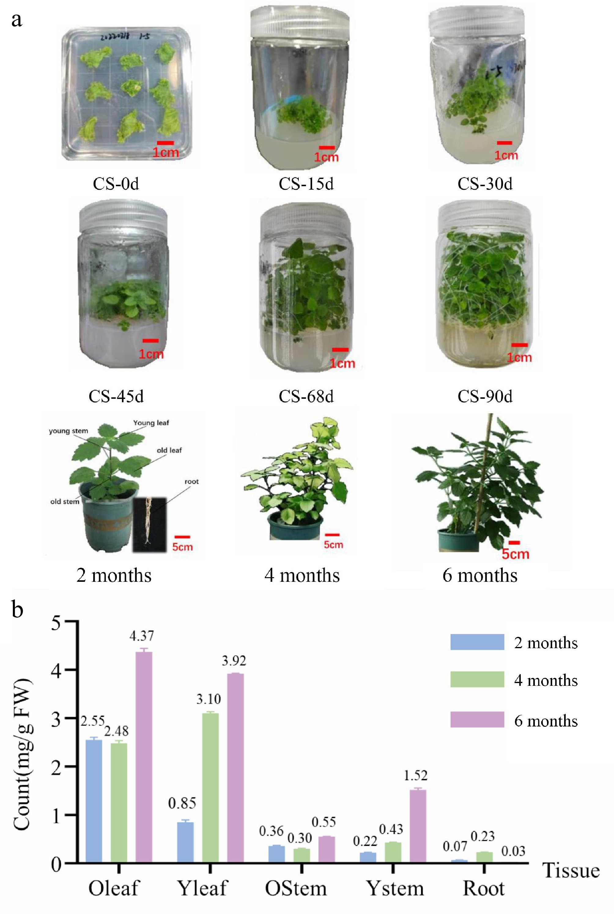Patchouli samples and total sesquiterpene compound content. (a) Samples from culture seeding (0, 15, 30, 45, 69, and 90 d), and soil growth (2, 4, and 6 months). (b) Total sesquiterpene compound content from different organization samples (2, 4, and 6 months). Total sesquiterpene compound content from culture seeding samples shown in Supplementary Tables S2 and S3.