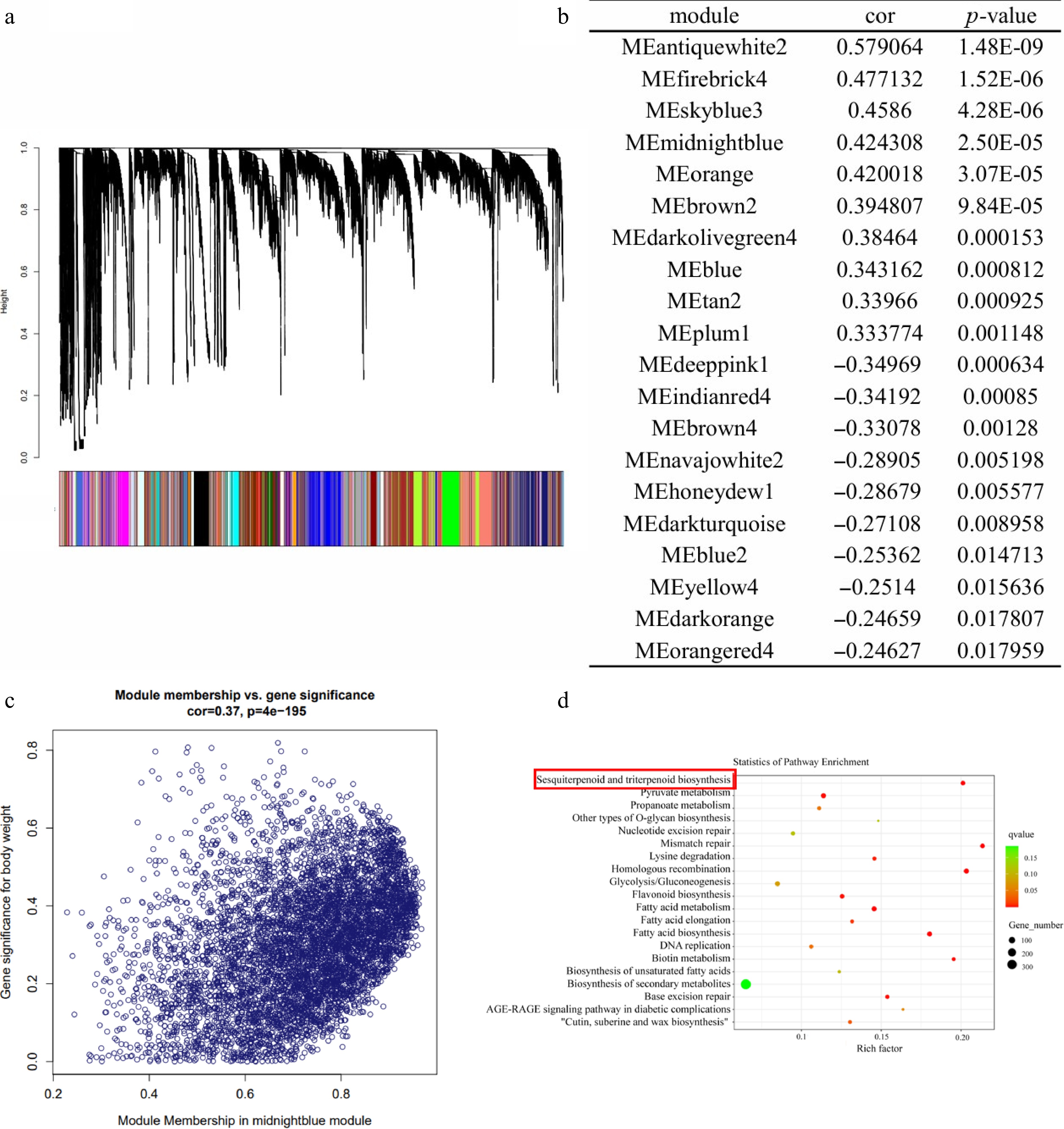Analysis of the co-expression network of patchouli genes. (a) Patchouli hierarchical clustering tree and its various modules. (b) Association analysis between modules and sesquiterpene content. (c) Correlation analysis of module midnightblue genes and sesquiterpene content of all patchouli samples. (d) GO annotation of Memidnightblue.