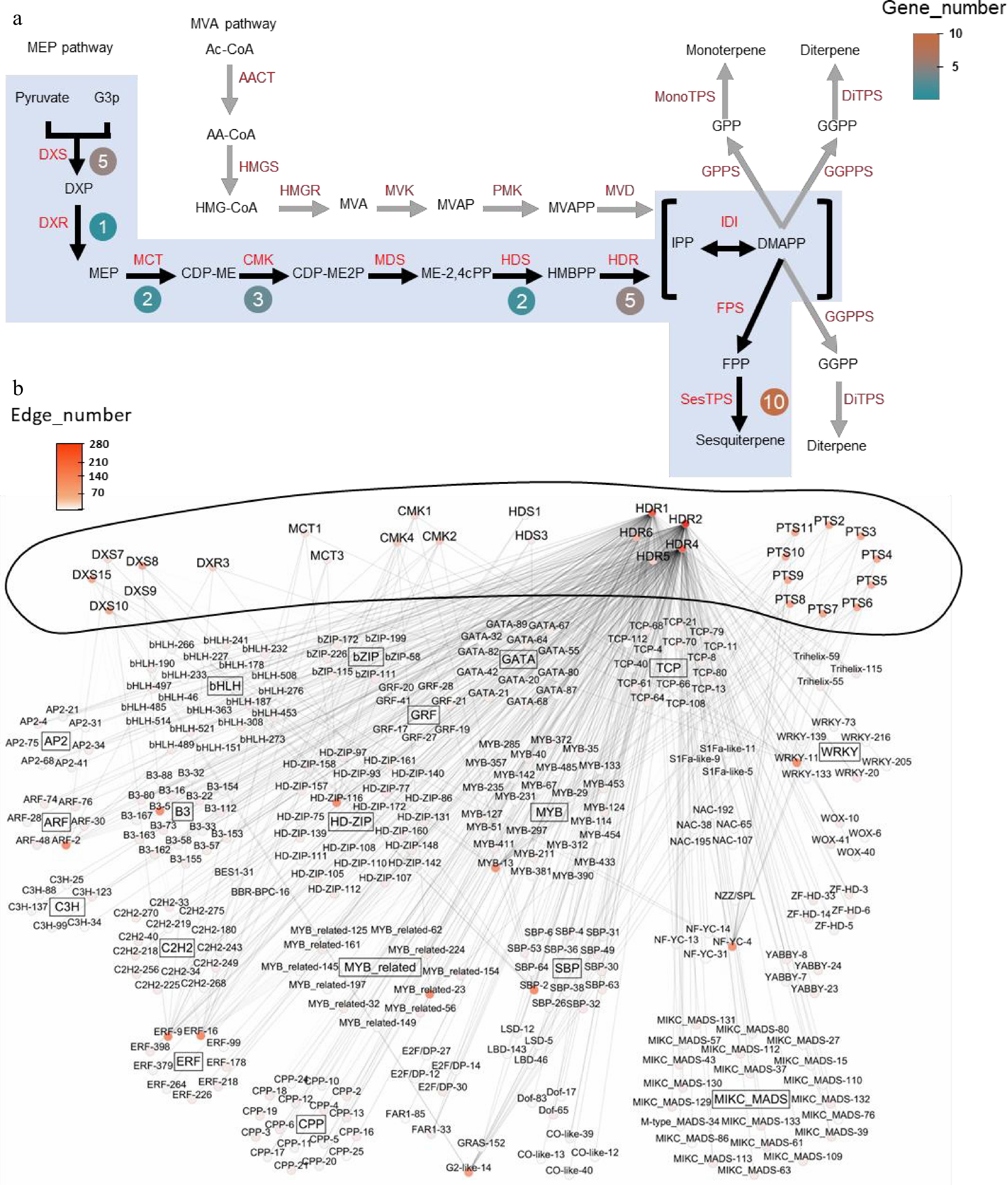 Co-expression network and key enzyme genes from sesquiterpenoid metabolic pathway of patchouli. (a) Genes from sesquiterpenoid metabolic pathway in patchouli, adapted from Shen et al.[15]. Black arrows and blue shadows indicate key reaction steps. Genes in red indicate enzymes in the pathways. Round boxes next to the enzymes contain the numbers of core pathway genes. (b) Co-expression network of the sesquiterpenoid metabolic pathway. The outer ring of the network represents key enzyme genes implicated in sesquiterpenoid metabolic pathway, while inside are TFs. Nodes are labeled with gene names colored based on the edge number. TFs and pathway genes are connected via undirected edges. Internal connections among TFs and among pathway genes were not shown for clarity. Detailed IDs, names, and connection information for all genes in the network can be found in Supplementary Tables S7 and S8.