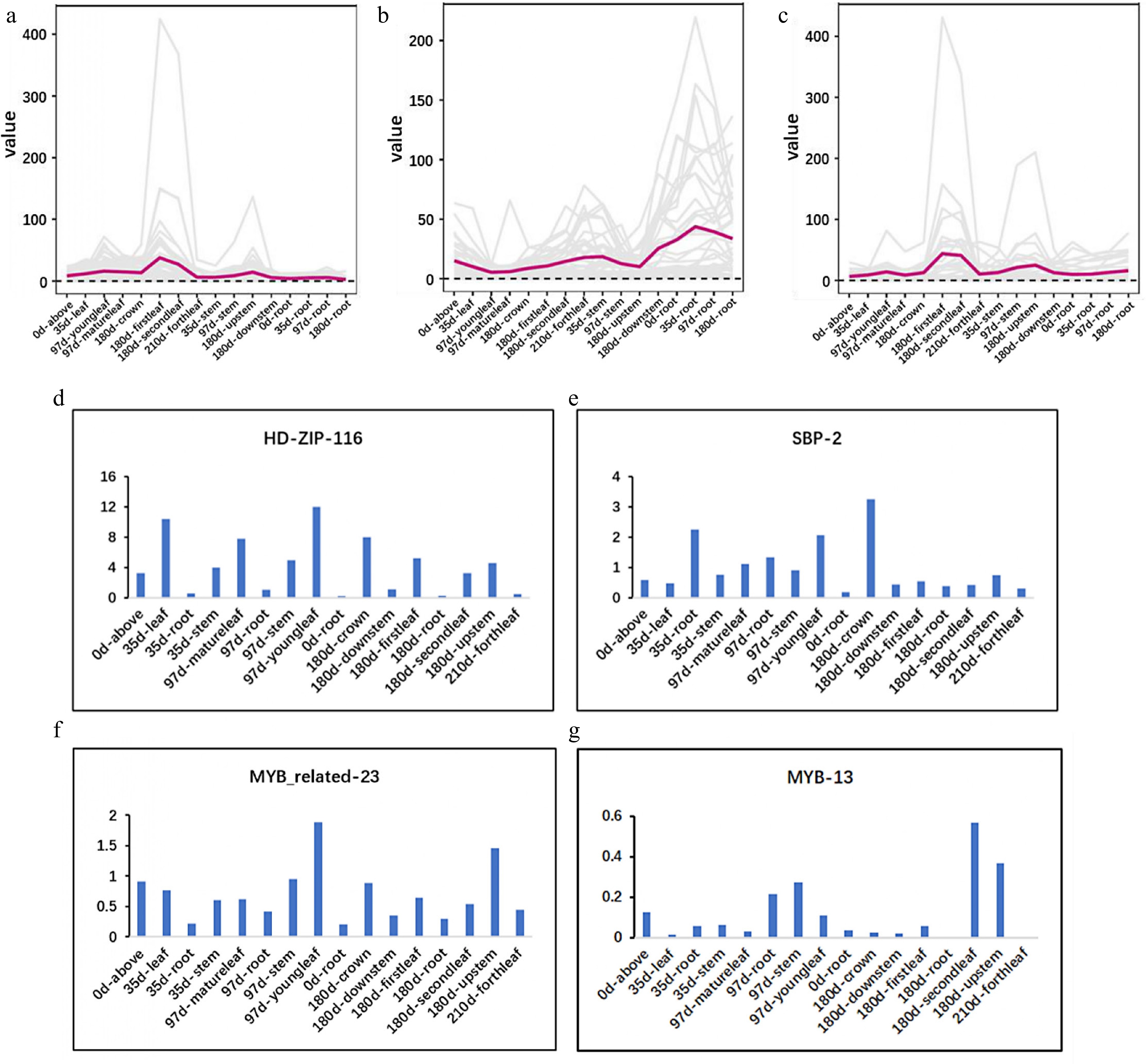 Expression pattern of the candidate TFs is consistent with that of MEP pathway. (a)−(c) Expression of MEP, MVA, and downstream pathway. (d)−(g) Expression of HDZIP116, SBP2, MYBR23, and MYB13.