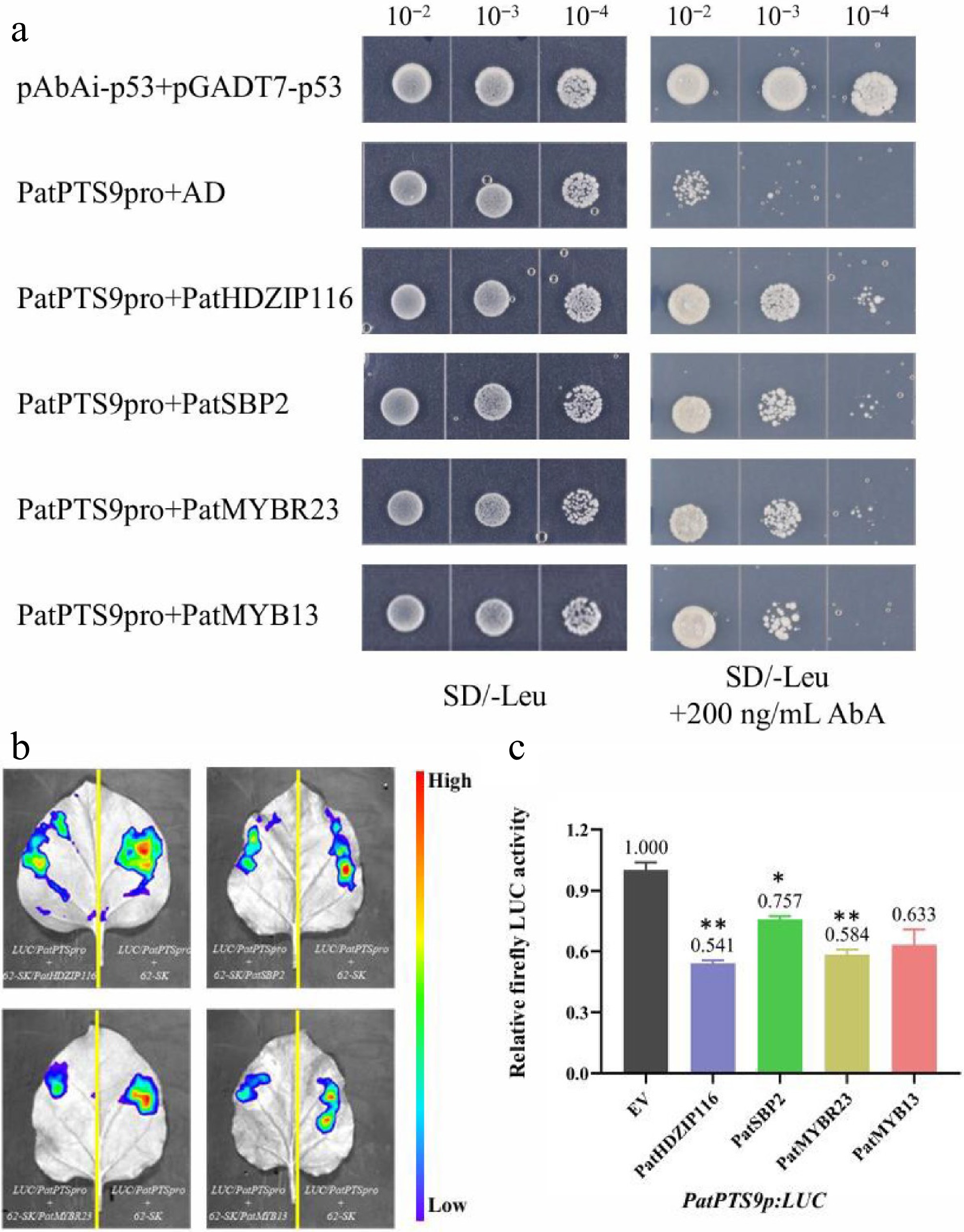 PatHDZIP116, PatSBP2, PatMYBR23, and PatMYB13 repress the Sesquiterpene synthase gene PatPTS9. (a) Y1H assay confirming the interaction between the PatPTS9 promoter and four TFs. (b) Dual-LUC reporter imaging assay. N. benthamiana leaves were injected with the Agrobacterial GV3101-pSoup-p19 stains containing 62-sk + PatPTS9p:LUC and 62-sk:PatTF + PatPTS9p:LUC. Arrow position indicates the strongest fluorescence. (c) Relative firefly LUC activity assay in tobacco leaves. Error bars are shown with three biological replicates (Student's t-test: * p < 0.05, ** p < 0.01).