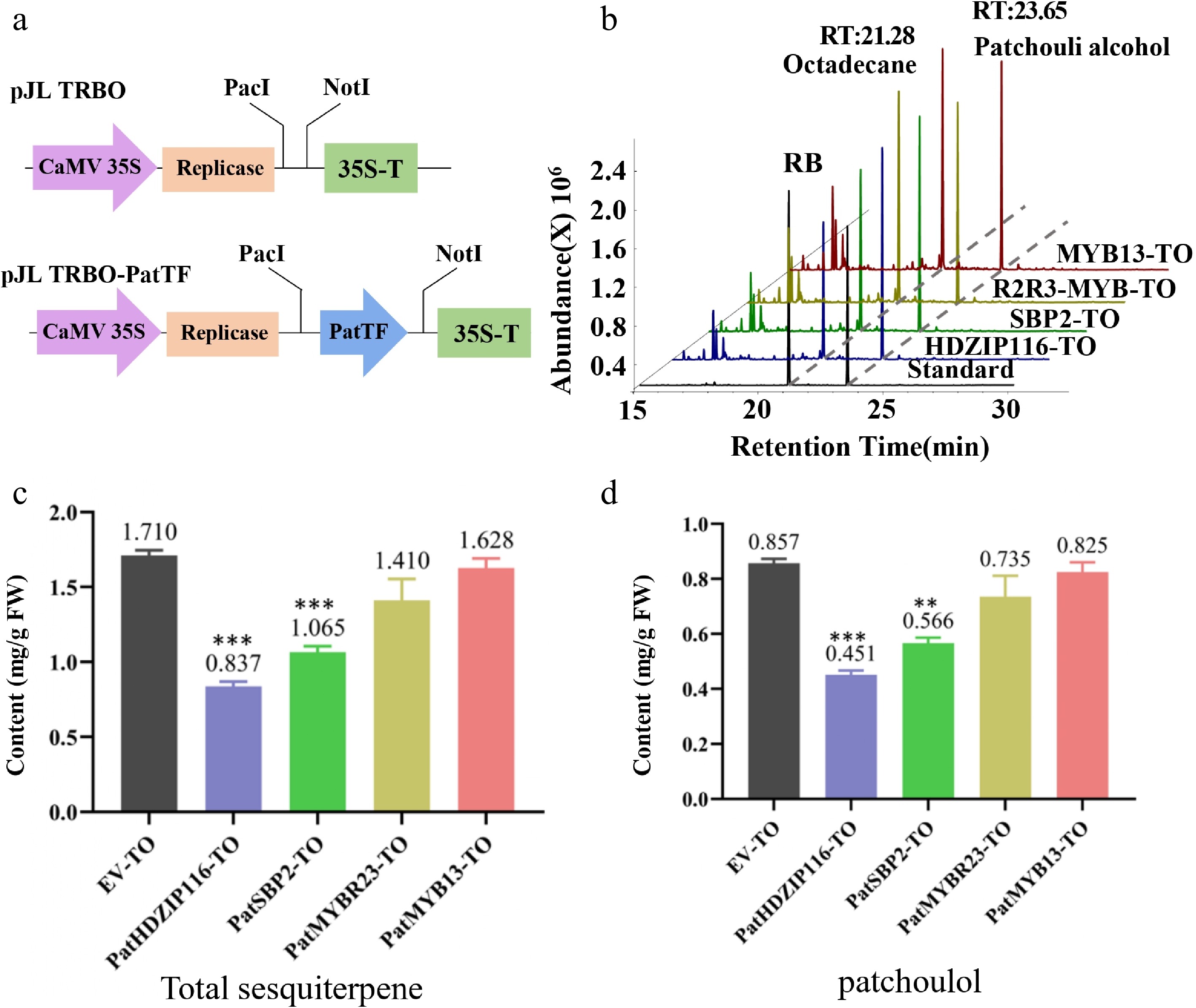 Analysis of the transient overexpression (TO) of four TFs in patchouli. (a) Schematic diagram of pJL TRBO-PatTF vector construction. (b) The chromatogram of patchouli content detected by GC-MS. (c, d) Compared with EV-TO, the (c) total sesquiterpene and (d) patchouli alcohol content in leaves infiltrated with PatTF-TO was significantly reduced. Values are the mean ± SD of three biological replicates. Student's t-test: * p < 0.05, ** p < 0.01, *** p < 0.001. FW, fresh weight; TO, transient overexpression; EV, pJL-TRBO empty-vector.