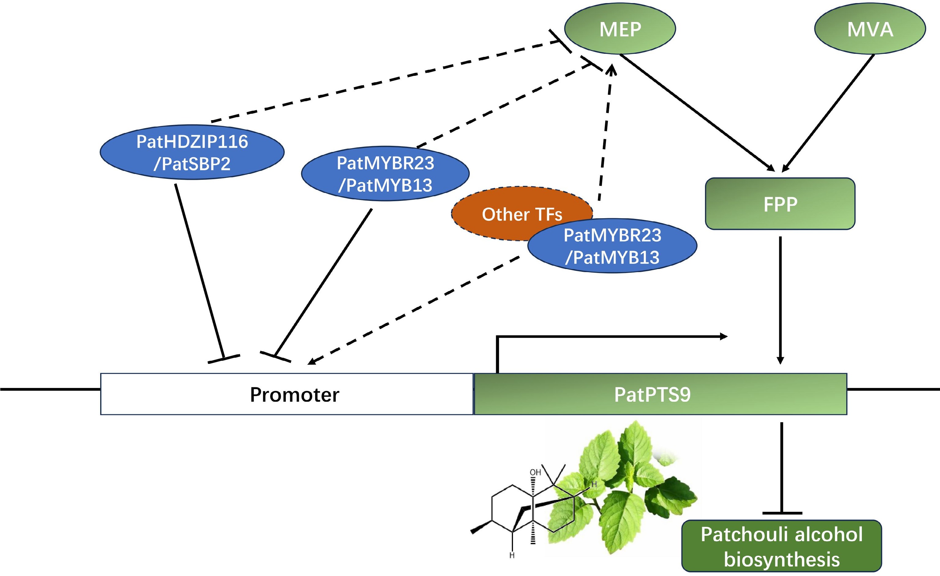 Model describing the regulation function of PatHDZIP116, PatSBP2, PatMYBR23, and PatMYB13 in patchouli alcohol biosynthesis. PatHDZIP116 and PatSBP2 negatively regulated patchouli alcohol biosynthesis by inhibiting the expression of PatPTS9, while PatMYBR23 and PatMYB13 might had more complex regulation mechanism.