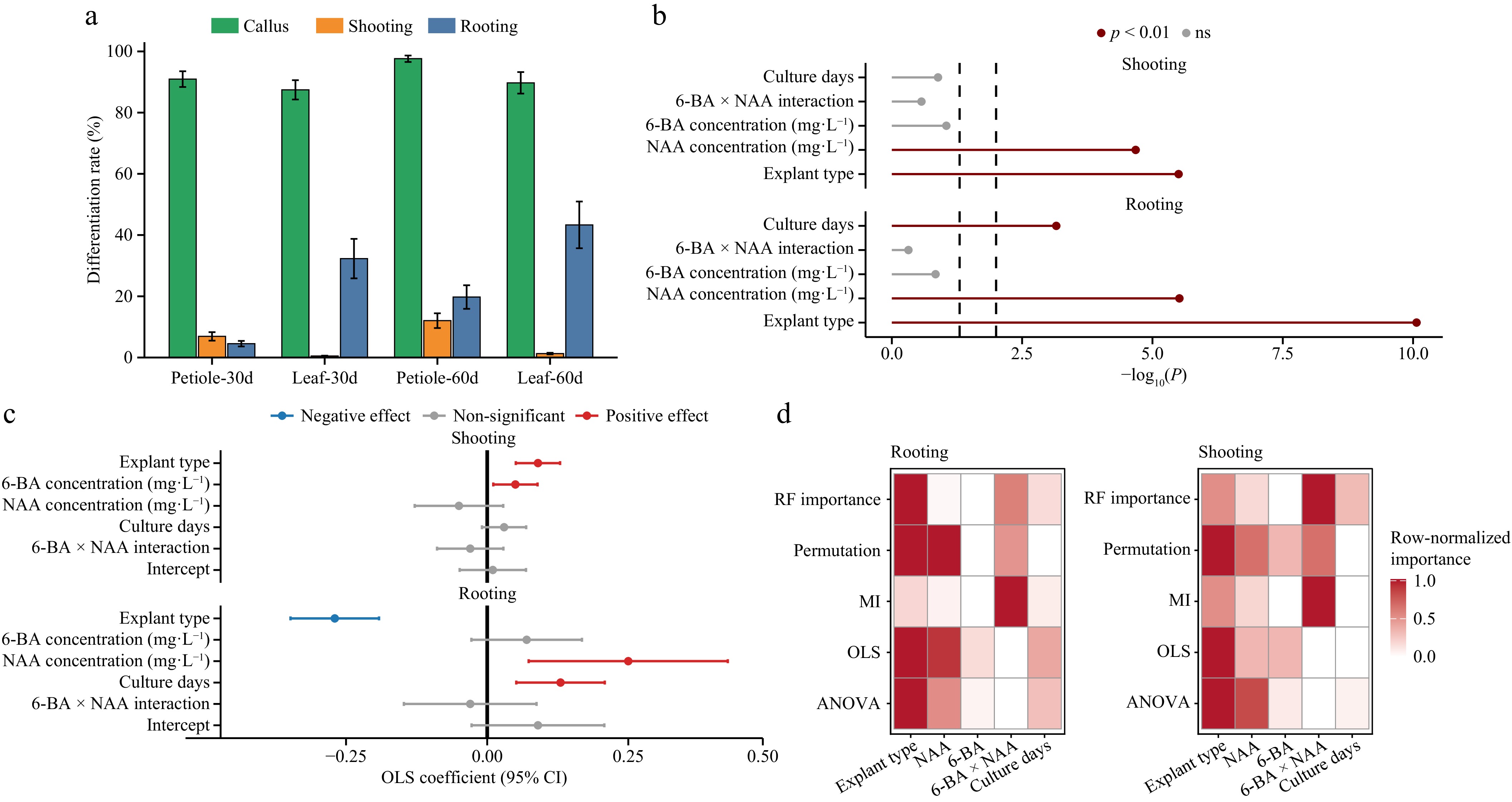 Statistical effects of explant type and hormone combinations on differentiation rates. (a) Mean (± SE) differentiation rates of leaf and petiole explants cultured for 30 and 60 d. Callus induction (green), shoot formation (orange), and rooting (blue) are shown. (b) Forest plot of two-way ANOVA results. The x-axis represents −log10(P), and dashed vertical lines indicate significance thresholds. Colors correspond to p < 0.01 and nonsignificant results (ns). (c) Ordinary least squares (OLS) regression coefficients with 95% confidence intervals. Positive effects are shown in red, negative effects in blue, and nonsignificant effects in gray. The solid vertical line represents zero effect. (d) Consensus heatmap of variable importance across analytical methods (ANOVA, OLS, mutual information, permutation importance, and random forest). Columns represent the explanatory variables (explant type, NAA, 6-BA, 6-BA × NAA interaction, and culture duration). Color intensity indicates the row-normalized relative importance (0–1), with darker shades representing higher importance. All analyses were performed on three biological replicates (n = 3). Detailed statistical results are provided in Supplementary Tables S3−S7, and the multimethod consensus ranking is summarized in Supplementary Table S8.