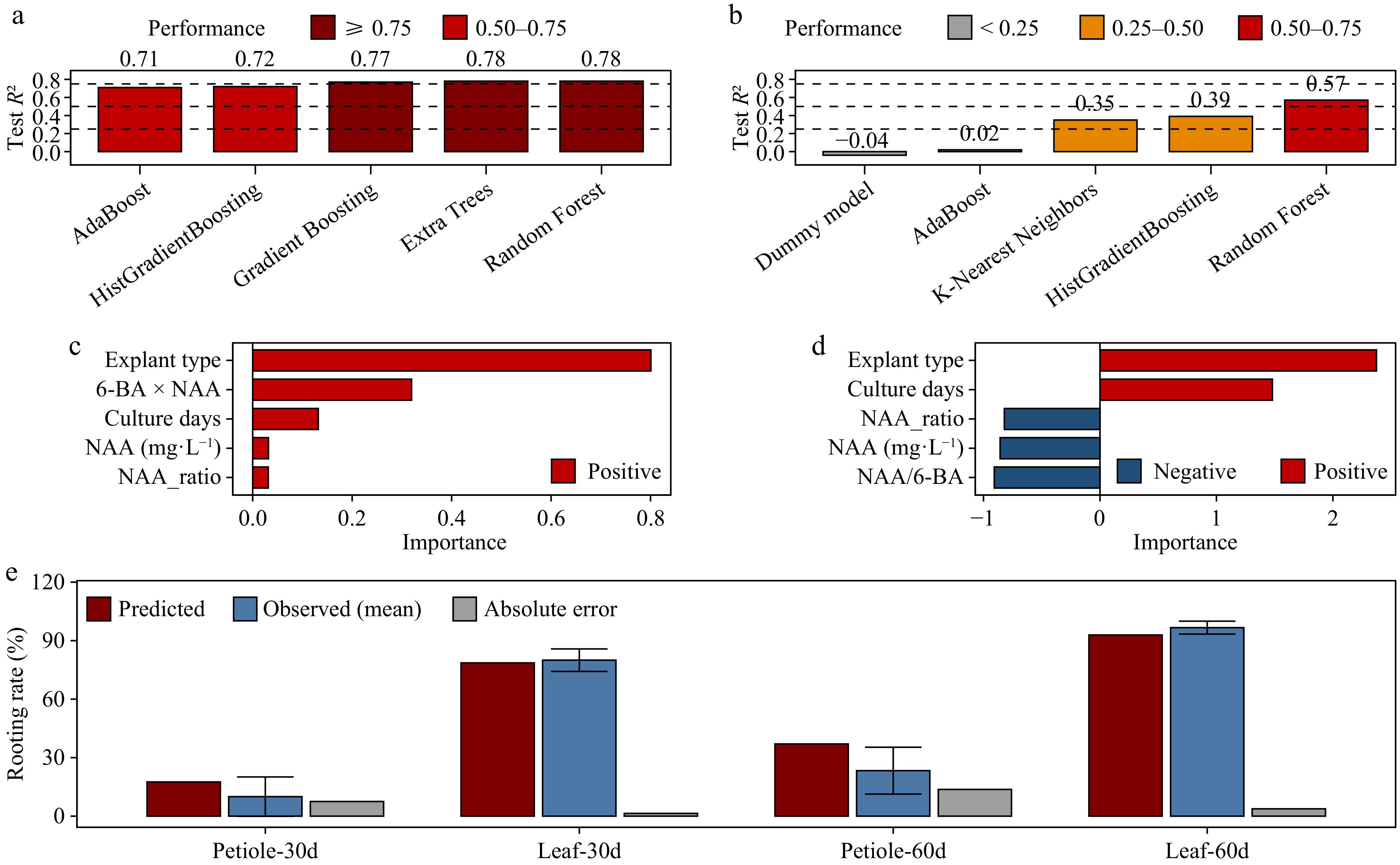 Machine learning-based analysis of regeneration predictions and factor importance. (a) Test performance (R2) of optimized models for predicting rooting rates. Bars indicate the predictive performance on independent test sets, with colors representing performance categories. Dashed horizontal lines indicate model classification thresholds. (b) Test performance (R2) of optimized models for predicting shooting rates. Model types are shown on the x-axis, and the test R2 on the y-axis; colors indicate performance categories. (c) Top five features contributing to rooting rate predictions in the optimized random forest model. Bar length indicates relative importance; red bars denote positive contributions. (d) Top five features contributing to shooting rate predictions in the optimized random forest model. Red and blue bars indicate positive and negative contributions, respectively; bar length represents the relative effect size. (e) Comparison of predicted and observed rooting rates for model-ranked conditions within the tested experimental space. Red bars indicate predicted values, blue bars indicate observed means, and gray bars indicate absolute prediction errors. Error bars denote the SE of observed values. Treatment groups correspond to explant type and culture duration. For leaf explants, the highest-ranked rooting condition identified by the model corresponded to the best-performing treatment observed experimentally. For petiole explants, the displayed comparisons are based on the experimentally tested hormone combinations closest to the model-ranked conditions and therefore do not represent a prospective validation of untested predictions. All models were trained and evaluated on three biological replicates (n = 3). Detailed performance metrics, feature importance analyses, and predicted vs observed comparisons are provided in Supplementary Tables S8−S14.