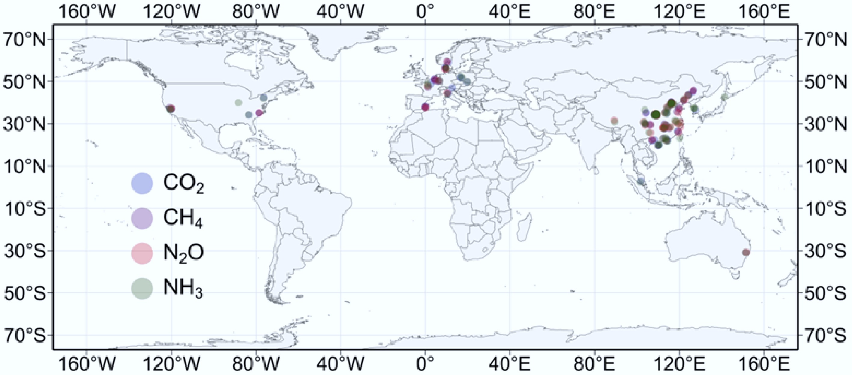 • As illustrated in Supplementary Fig. S1, peer-reviewed literature was systematically retrieved from two authoritative databases: Web of Science (WoS) and the China National Knowledge Infrastructure (CNKI) (2000–2024). The search combined gas terms (CO2, CH4, N2O, NH3, and GHGs) with composting terms (compost, biochar) to identify studies on composting systems. Following the initial retrieval, we deduplicated and screened articles for relevance to our study objectives. The eligibility criteria required: (1) a biochar vs. control comparison, (2) no co-additives, (3) ≥ 1 target gas emission reported, and (4) valid measurement methods. This identified 123 studies (WOS: 120; CNKI: 3) with 251 paired comparison and 1,184 observations (Supplementary File 1). The global distribution of the selected studies is presented in Fig. 1.