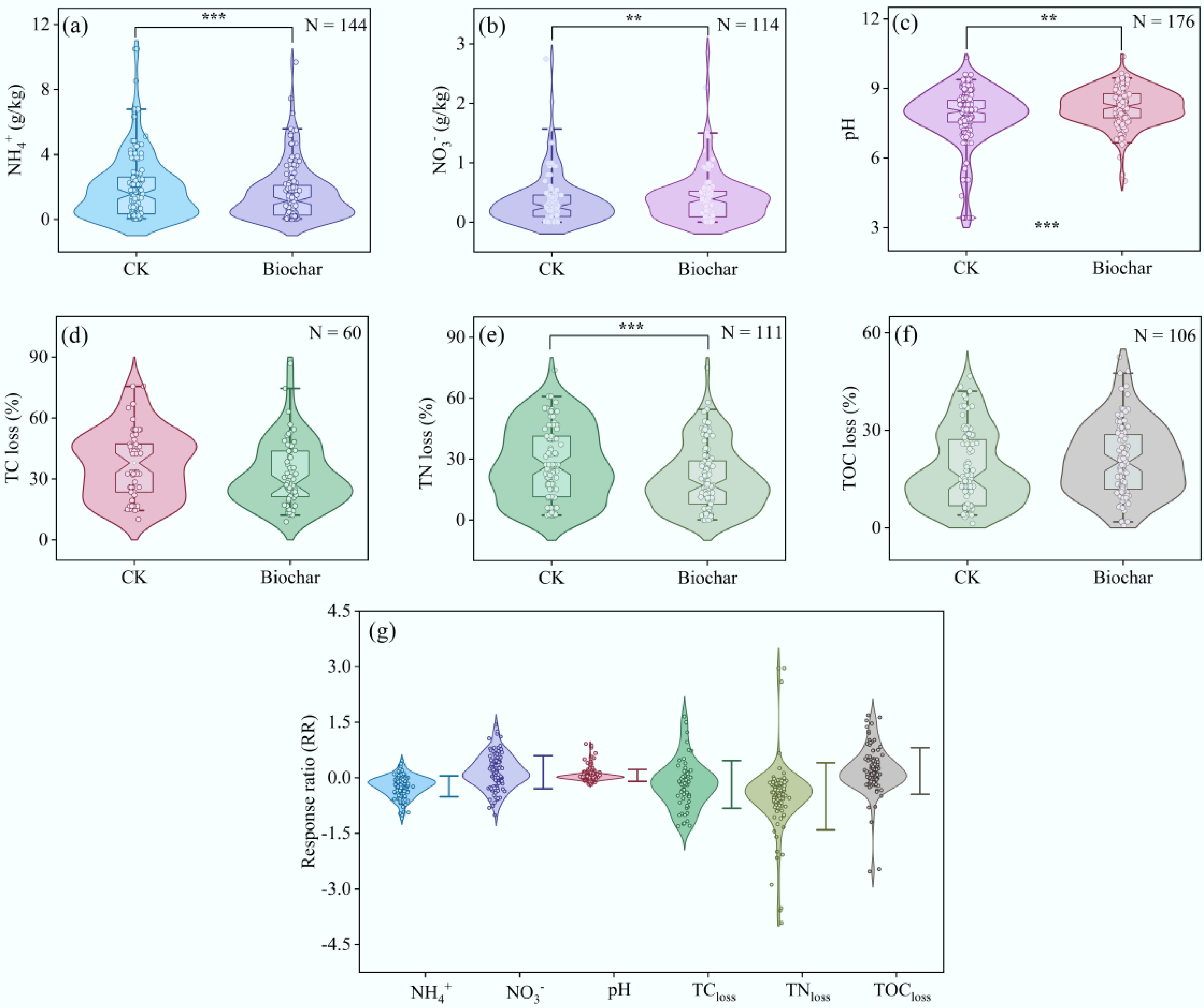 Violin plots of NH4+, NO3, pH, TC loss, TN loss, and TOC loss in the control (CK) and biochar-amended composting systems (a)–(g). N denotes the number of paired samples, with asterisks indicating the statistical significance levels (* p < 0.05, ** p < 0.01, and *** p < 0.001). The response ratios (RR) of NH4+, NO3, pH, TC loss, TN loss, and TOC loss are shown in (f). The color-coded point markers on the right represent the mean RR values, with the error bars indicating standard deviations.