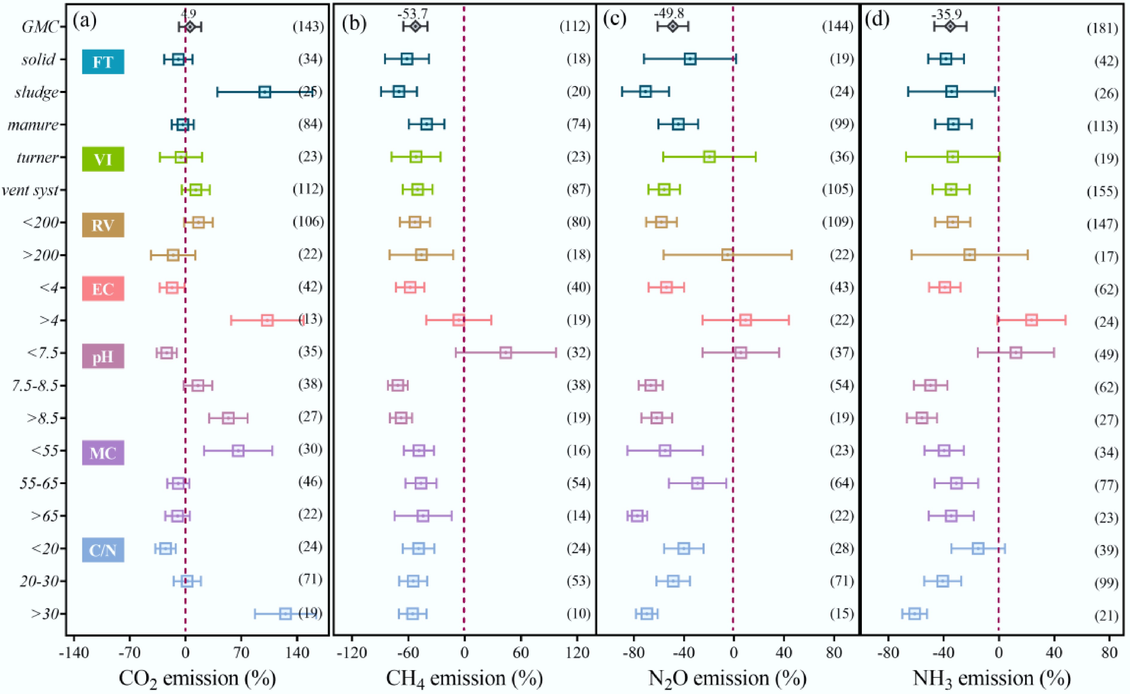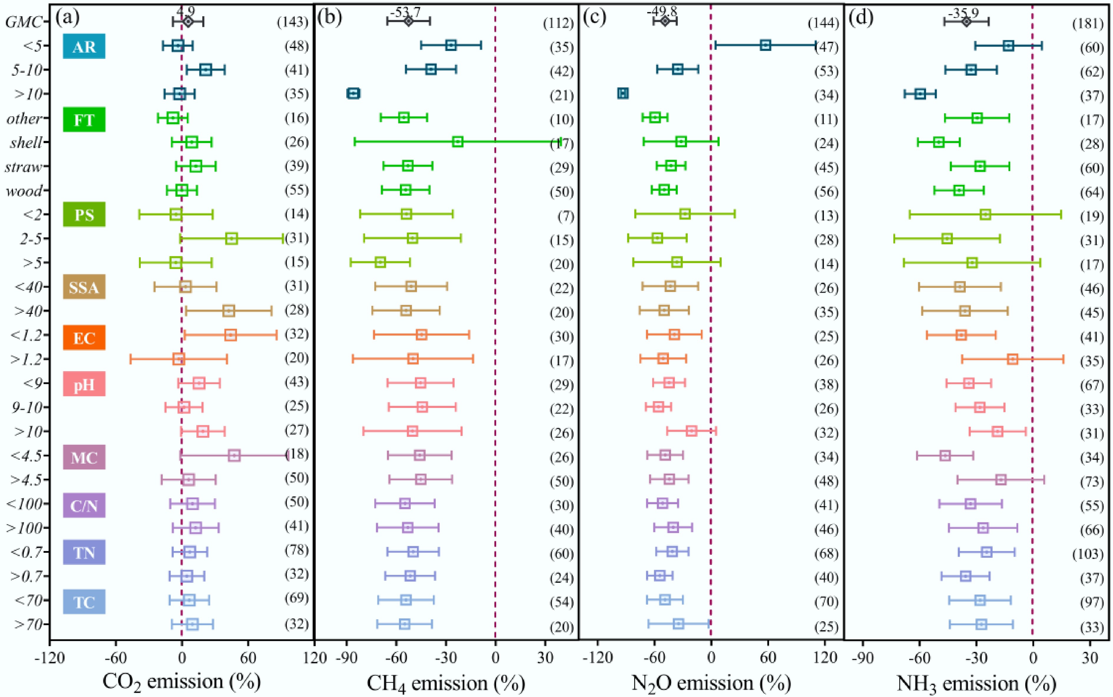 Abstract: Composting is valuable for recycling resources and environmental protection, but it emits greenhouse gases, namely carbon dioxide (CO2), methane (CH4), and nitrous oxide (N2O), and ammonia (NH3). Biochar can reduce greenhouse gases and NH3 emissions, but its effects and mechanisms in composting are debated. We conducted a global meta-analysis of 123 published studies (251 paired comparisons and 1,184 observations) to identify the dominant factors and underlying mechanisms driving CO2, CH4, N2O, and NH3 emissions during biochar-amended composting. Biochar amendment significantly reduced emissions of CH4 (53.7%), N2O (49.8%), and NH3 (35.9%), but had no significant effect on CO2 emissions. The application rate of biochar was the key parameter affecting CH4, N2O, and NH3 emissions, demonstrating a dose effect on mitigation efficacy. Biochar decreased CH4, N2O, and NH3 emissions under most parameters, except acidic conditions. Although a high carbon:nitrogen ratio (> 30) and a low moisture content (< 55%) increased CO2 emissions, high electric conductivity (> 4 mS/cm) impaired the mitigation effects of biochar on all target gases. To achieve optimal composting performance to mitigate trace gases, the following parameters are recommended: a carbon : nitrogen ratio of 20–30, a moisture content of 55%–65%, pH 7.5–8.5, an electric conductivity of < 4 mS/cm, and a biochar dosage of 10%–20% (w/w, dry weight).