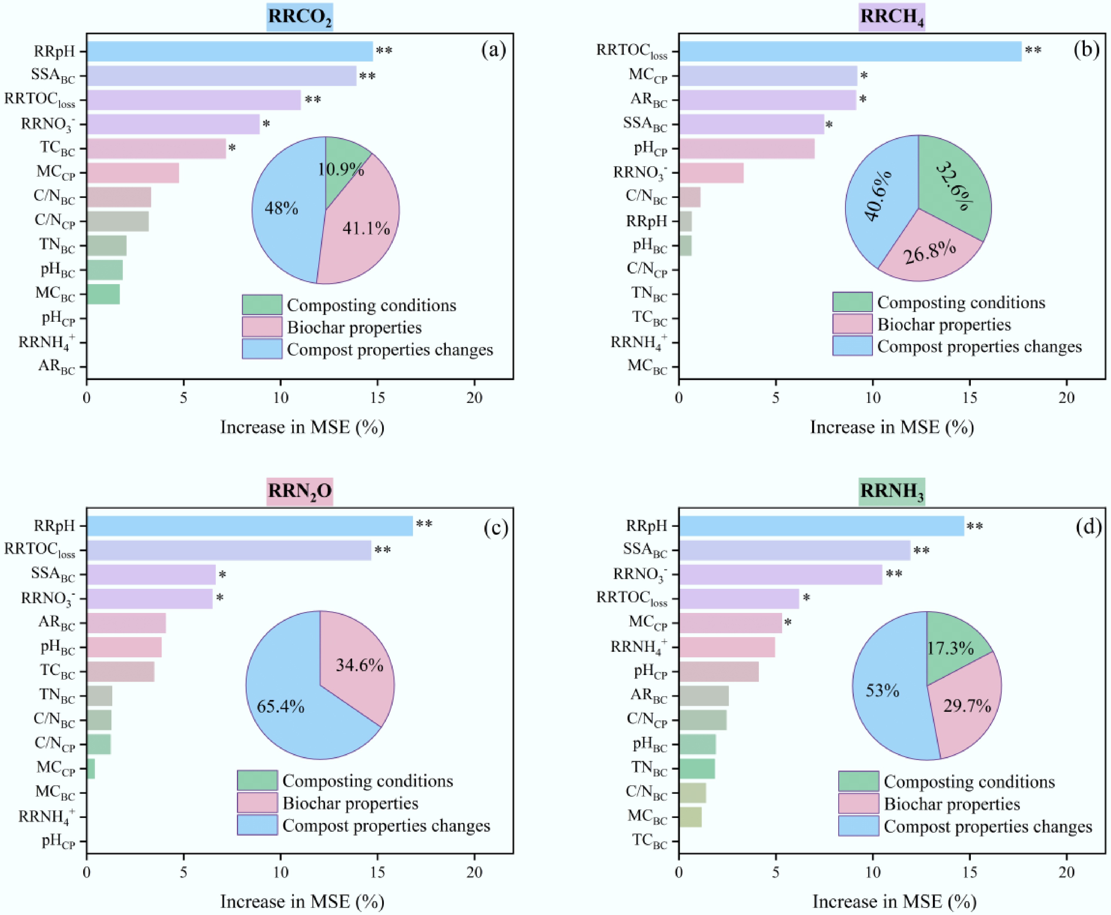 Random Forest models used to rank the predictive variables of response ratios (RR) of CO2, CH4, N2O, and NH3 emissions (a)–(d). The percentage increase in the mean squared error (%IncMSE) represents the importance of the main predictors; negative values of %IncMSE are not shown. Statistical significance levels are denoted by asterisks (* p < 0.05 and ** p < 0.01). The predictive variables are categorized into three classes, namely composting conditions, biochar properties, and changes in compost properties. Composting conditions include the carbon : nitrogen ratio (C/N), moisture content (MC), and initial pH. Biochar properties include total carbon (TC), total nitrogen (TN), C/N, MC, pH, specific surface area (SSA), and application rate (AR). Changes in compost properties include the RRs of NH4+, NO3 final pH, and TOC loss.