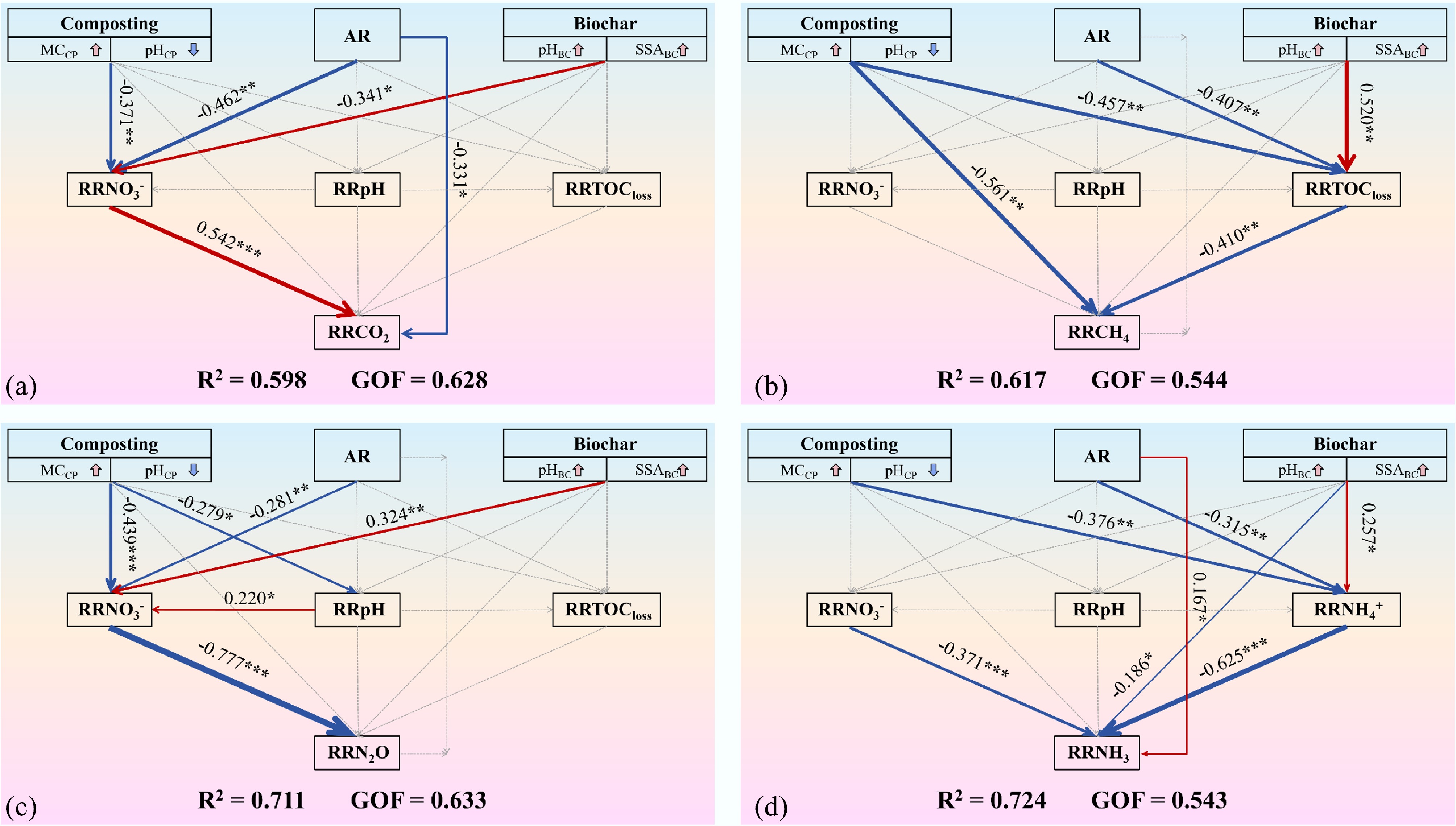 Partial least squares path models (PLS-PMs) demonstrating how composting conditions (MCCP, moisture content of compost; pHCP, initial pH of compost), the application rate of biochar (AR), biochar properties (pHBC, pH of biochar; SSABC, specific surface area of biochar), and changes in compost properties (RRNO3, response ratio of average NO3 contents; RRpH, response ratio of final pH; RRTOCloss, response ratio of total organic carbon loss; RRNH4+, response ratio of average NH4+ contents) influence the response ratios of (a) CO2, (b) CH4, (c) N2O, and (d) NH3 emissions. Pink and blue arrows refer to positive and negative relationships (* p < 0.05, ** p < 0.01, and *** p < 0.001). Dotted arrows denote insignificant correlations (p > 0.05). The numbers next to the arrows indicate the standardized path coefficient.