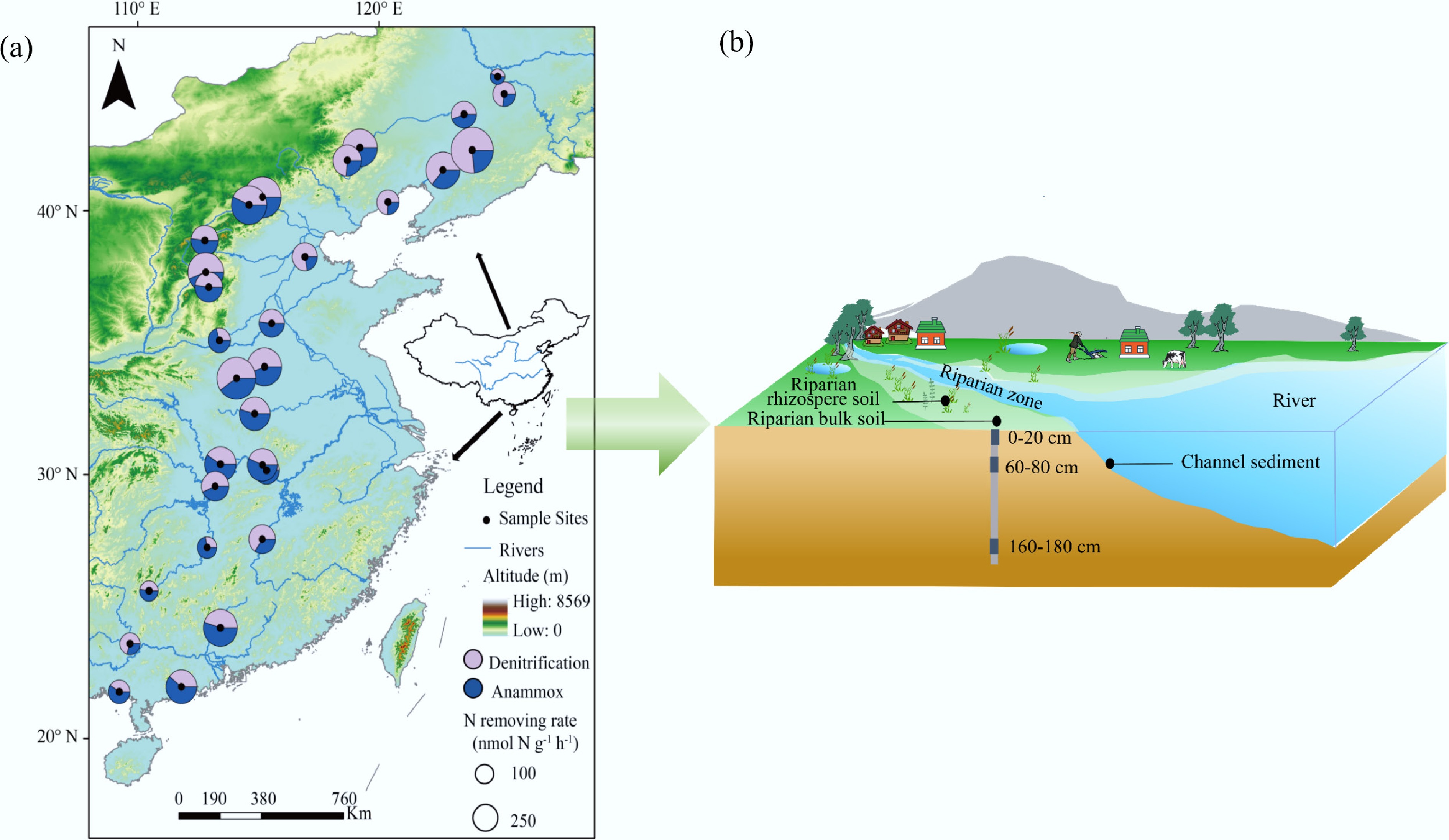 (a) Biogeographical distribution of denitrification (purple), and anammox (blue) rates across 30 sampling sites, and (b) the schematic diagram of the sampling strategy. Each black circle represents a sampling site, with circle size proportional to the N removal rates at that location. N removal rates are calculated as the sum of values from channel sediments, riparian rhizosphere soils, and riparian bulk soils at three depth intervals (0–20, 60–80, and 160–180 cm).