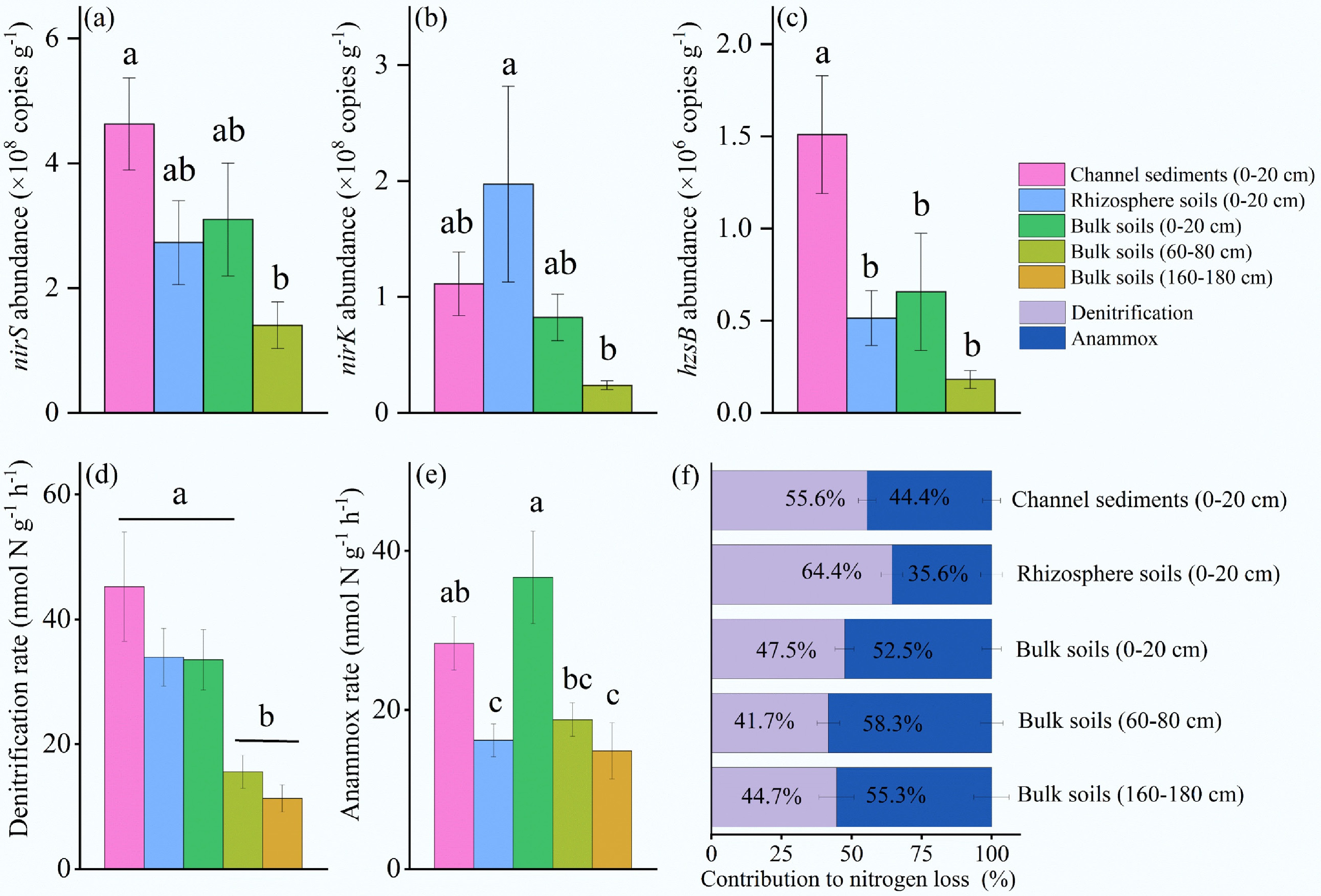 (a)−(f) Abundances of nirS, nirK, and hzsB genes, denitrification and anammox rates, and their relative contributions to N removal (mean ± SE) in channel sediments, riparian rhizosphere soils, and riparian bulk soils. Different lowercase letters above the bars indicate significant differences (p < 0.05) among soil types.