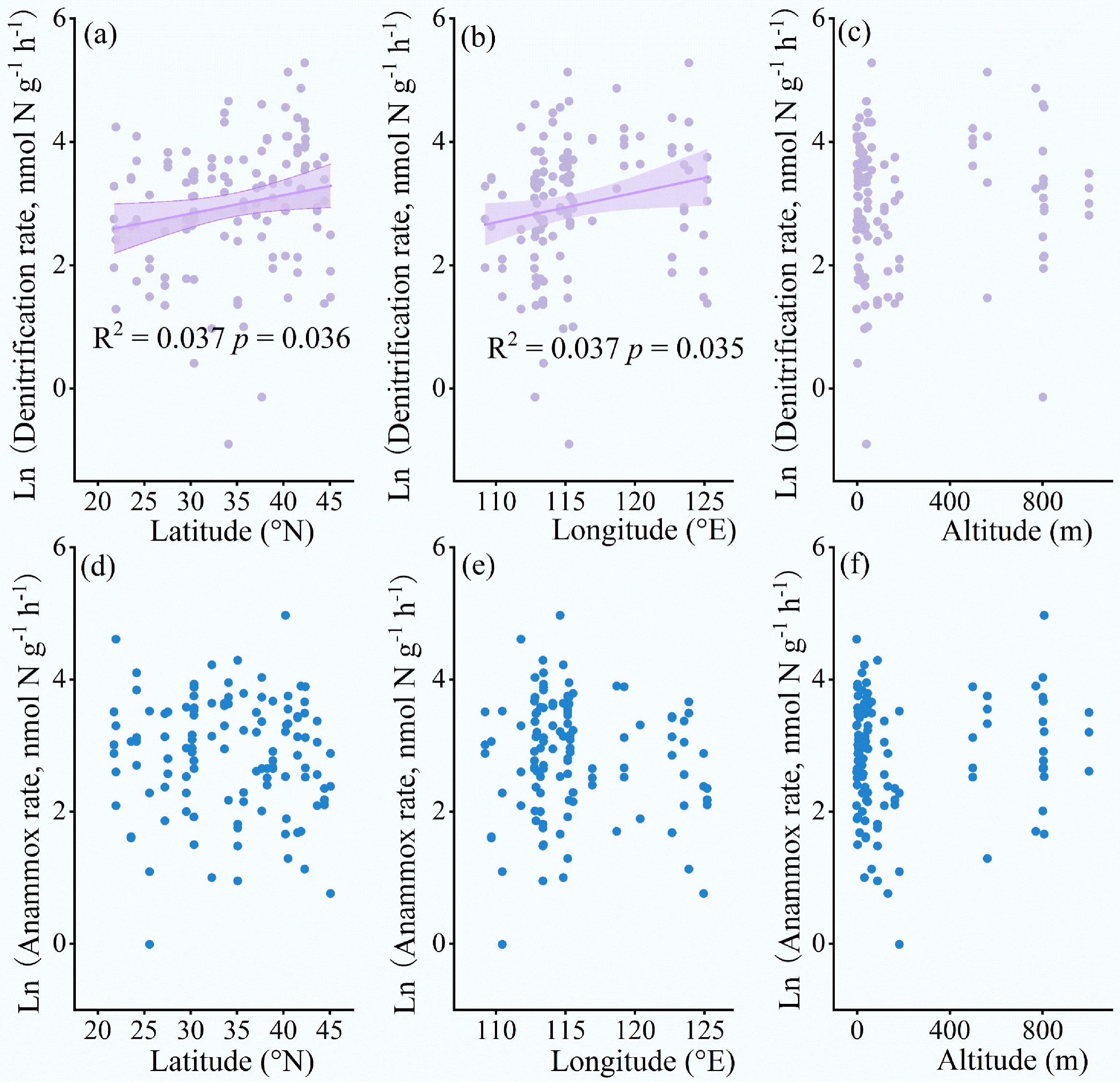 (a)−(f) Relationships between denitrification and anammox rates and geographic variables (latitude, longitude, and altitude). The purple lines are the slopes from the linear regression models, while the purple shadings are the 95% confidence intervals.