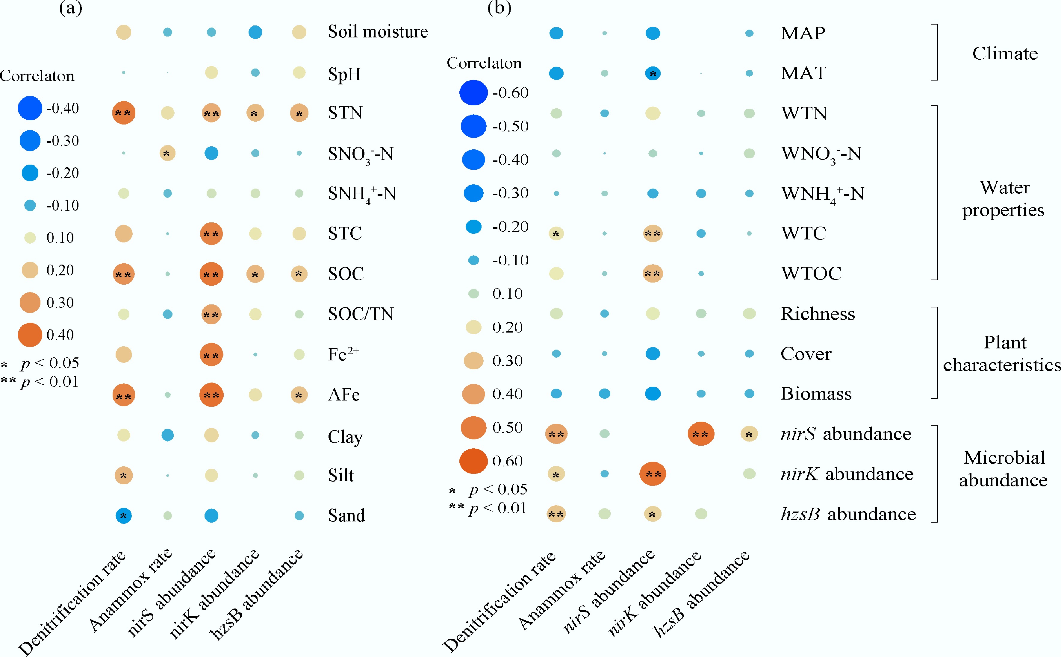 • Among regional-scale factors, latitude and longitude were significantly positively related to denitrification rates (Fig. 3 and Supplementary Fig. S1). In contrast, anammox rates showed no significant relationship with either latitude or longitude (Fig. 3 and Supplementary Fig. S1). In addition, altitude, MAT, and MAP had no significant relationship with denitrification and anammox rates (Figs 3 and 4). For local-scale factors, numerous soil and water physicochemical properties were significantly related to denitrification rates (Fig. 4). For example, soil TN, SOC, AFe, and water TC were positively associated with denitrification rates, while the percentage of sand was negatively related to denitrification rates (Fig. 4). Moreover, the abundance of nirS genes was significantly and positively related to denitrification rates (Fig. 4).