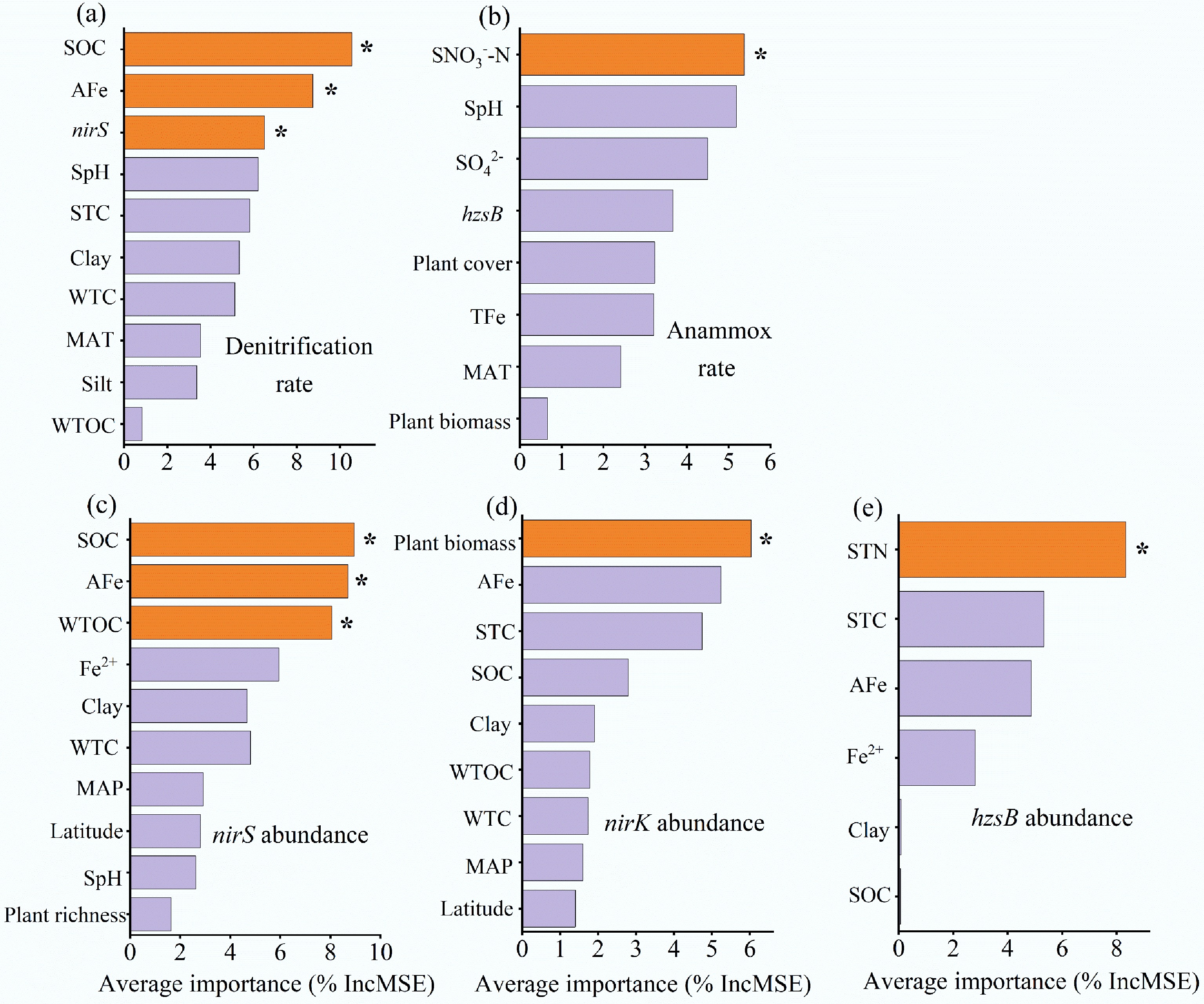 (a)−(e) Relative importance of the main predictive factors in explaining denitrification rates, anammox rates, and the abundances of nirS, nirK, and hzsB genes. * Indicate variables with significant importance (p < 0.05).