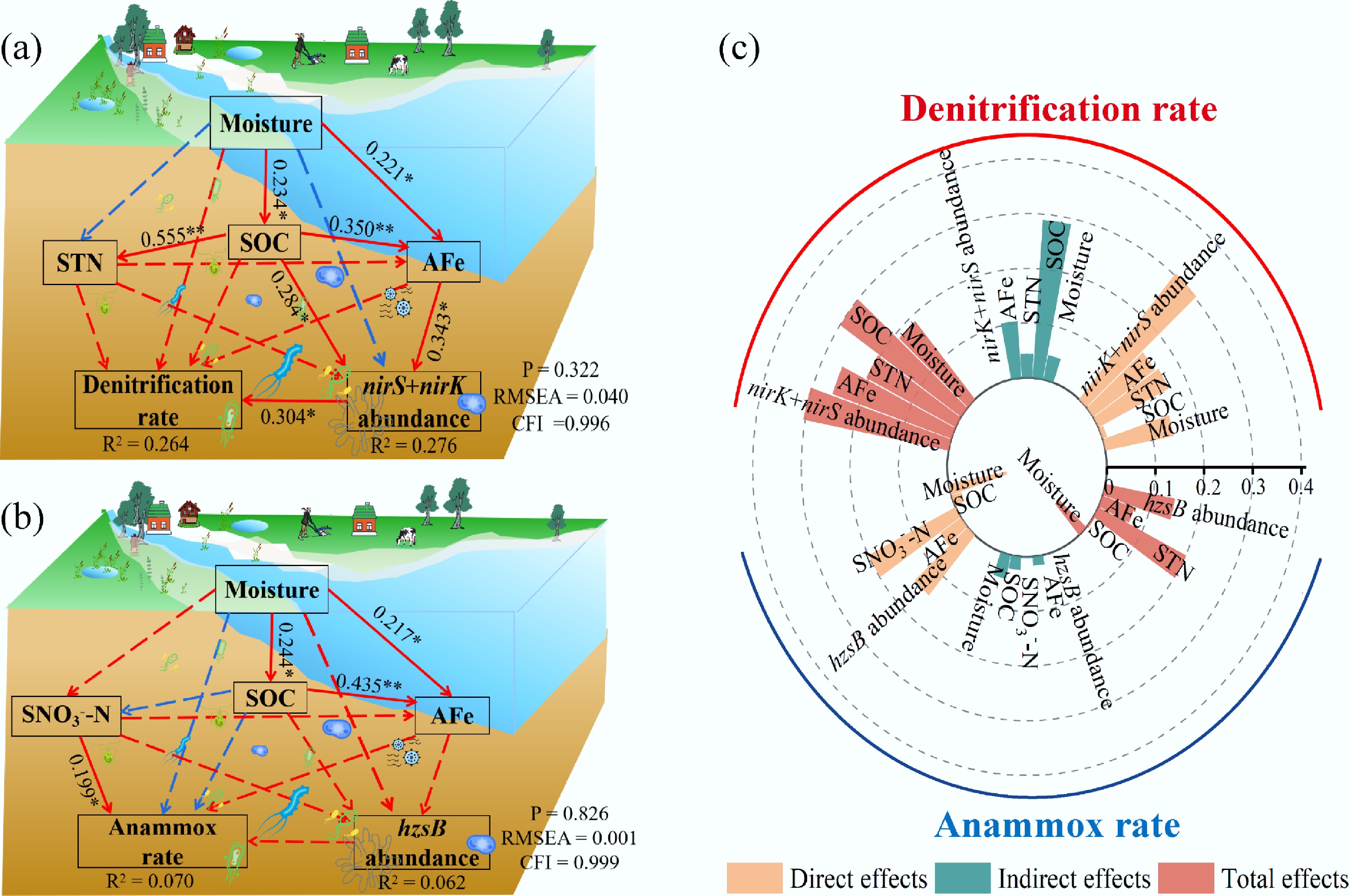 • For the denitrification rate model (p = 0.322, CFI = 0.996, and RMSEA = 0.040), the selected variables collectively explained 26.4% of the variance in denitrification rates (Fig. 6a). Denitrifier abundance was identified as the most influential factor affecting denitrification rates (Fig. 6c). Soil moisture, SOC, and AFe appeared to affect denitrification rates both directly and indirectly by modulating denitrifier abundance (Fig. 6a). In the anammox rate model (p = 0.826, CFI = 0.999, and RMSEA = 0.001), only soil NO3 had a direct and significant effect on anammox rates (Fig. 6b). The final model, which incorporated direct and indirect effects of soil moisture, SOC, NO3, AFe, and hzsB gene abundance, explained just 7.0% of the variation in anammox rates (Fig. 6b).