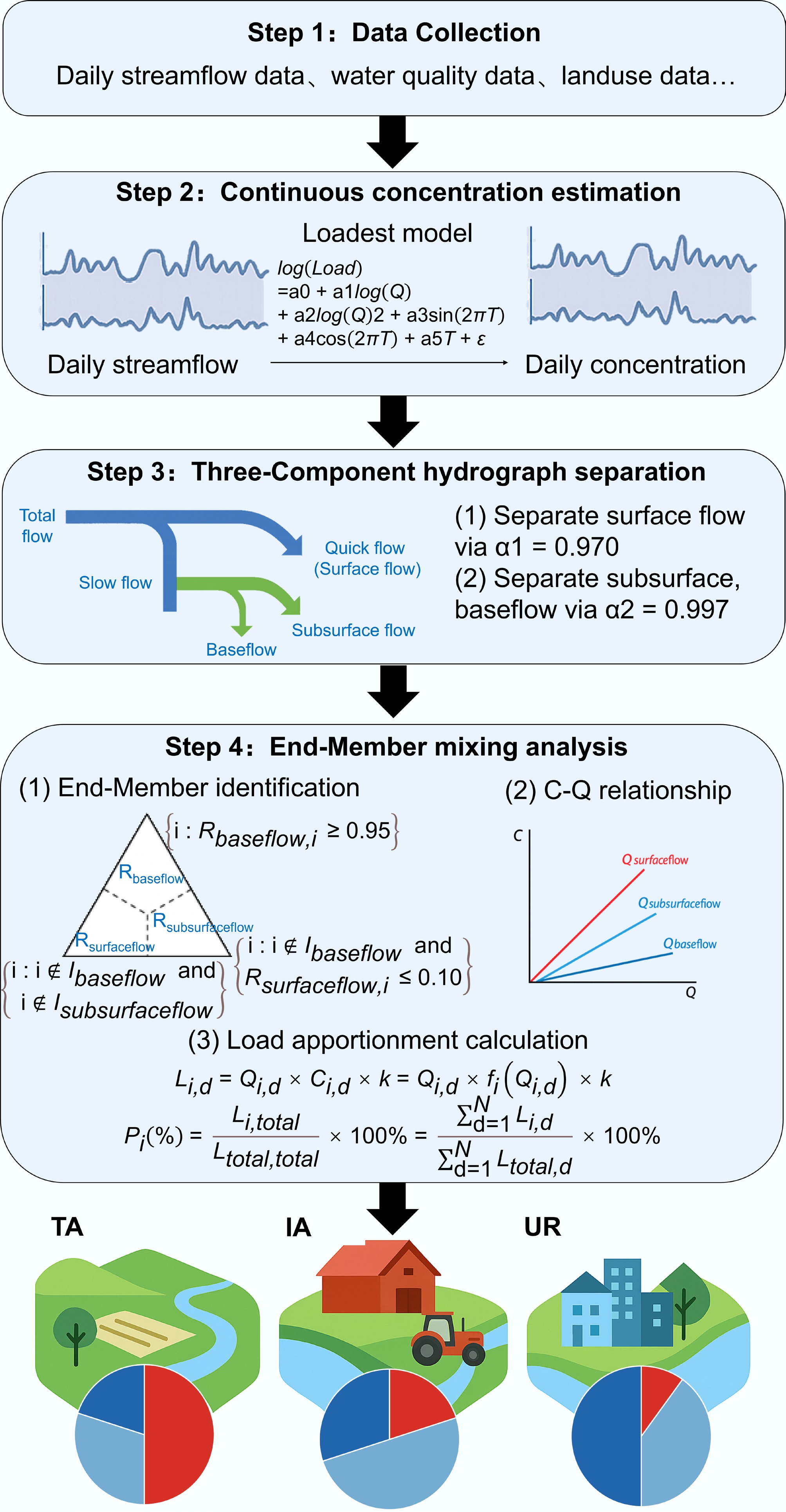 To attribute total nutrient loads to their constituent hydrological pathways, a novel analytical framework was developed and applied: the Pathway-based End-Member Mixing Analysis (EMMA). The integrated structure of this framework is illustrated in Fig. 2, which outlines the sequential steps from the initial hydrograph separation, through the characterization of pathway end-members using concentration-discharge (C-Q) relationships, to the final load apportionment. Conceptually, this framework treats the three distinct flow paths as independent 'end-members' that mix to produce the total load observed at the watershed outlet.