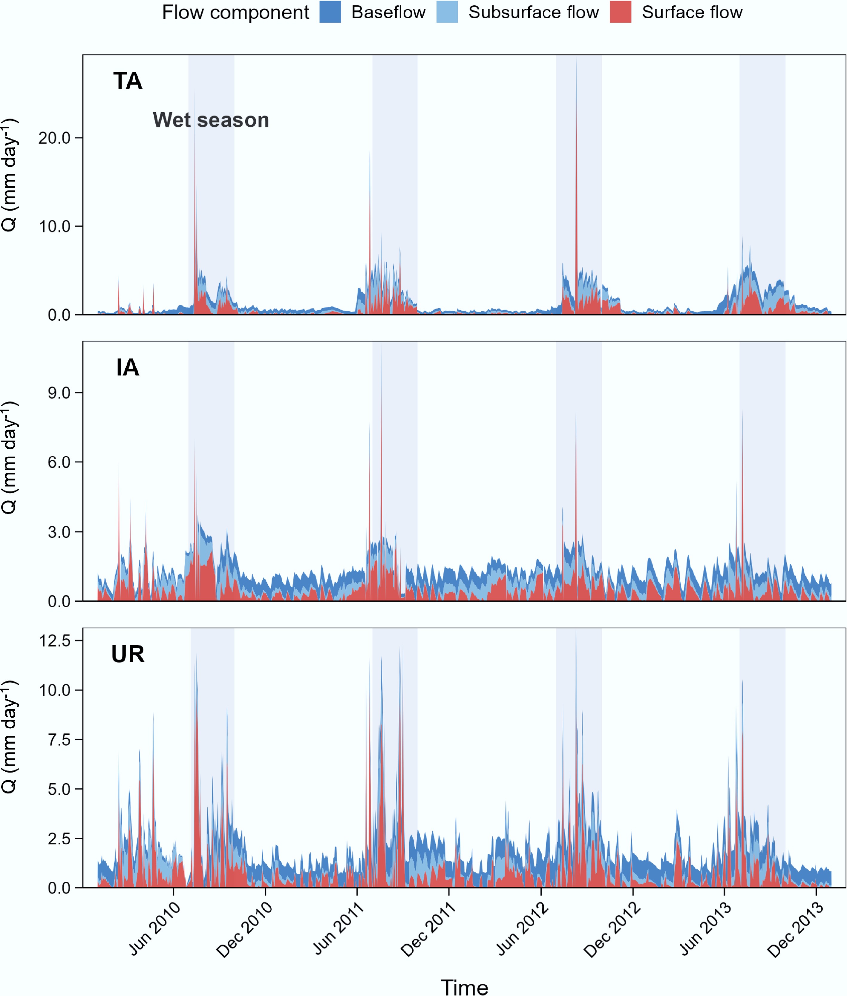 Hydrological pathway separation showing flow components (baseflow, subsurface flow, and surface flow) across the three study watersheds. TA represents traditional agricultural area, IA represents intensive agricultural area, and UR represents urban area. Gray shaded areas indicate wet seasons.