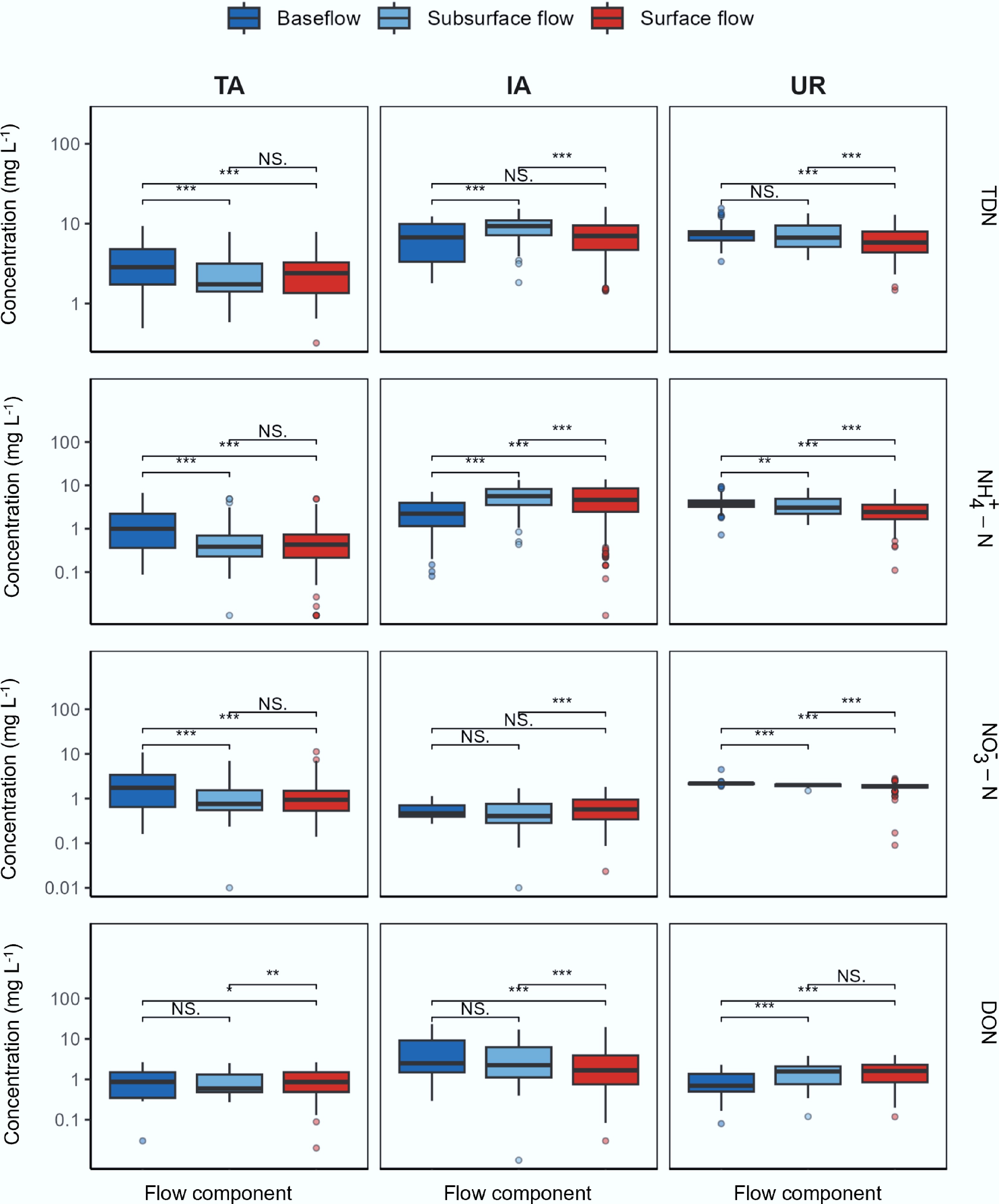 Concentration distributions of N species (TDN, NH4+−N, NO3−−N, and DON) across flow components in the three study watersheds. ( NS. : p > 0.05; * p < 0.05; ** p < 0.01; *** p < 0.001).