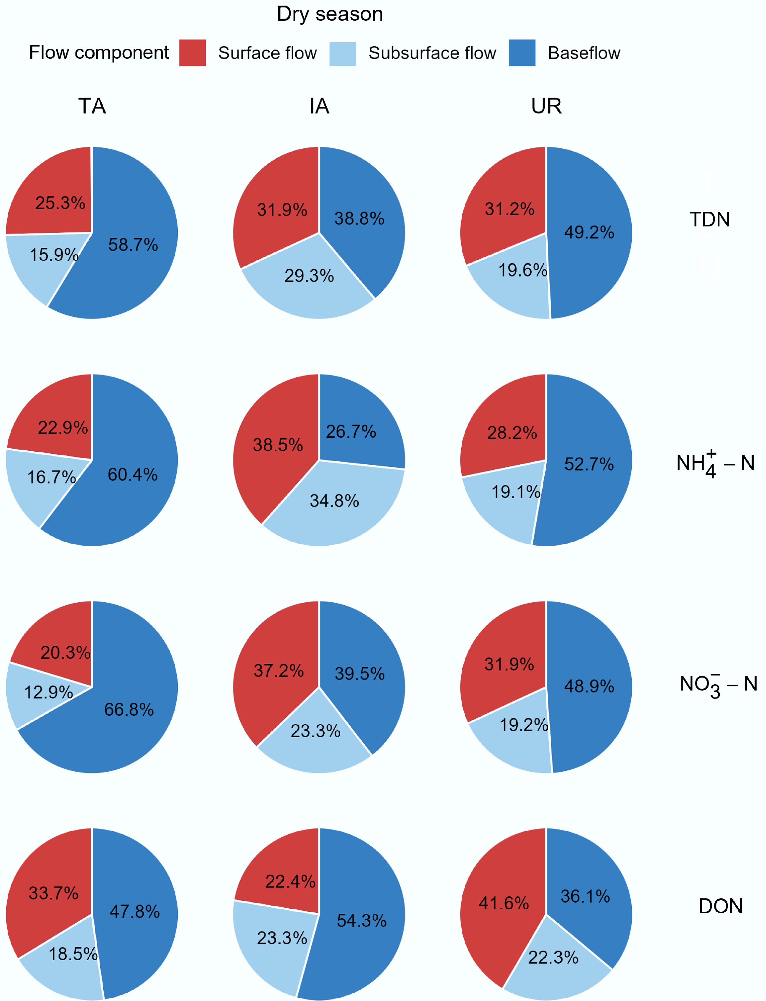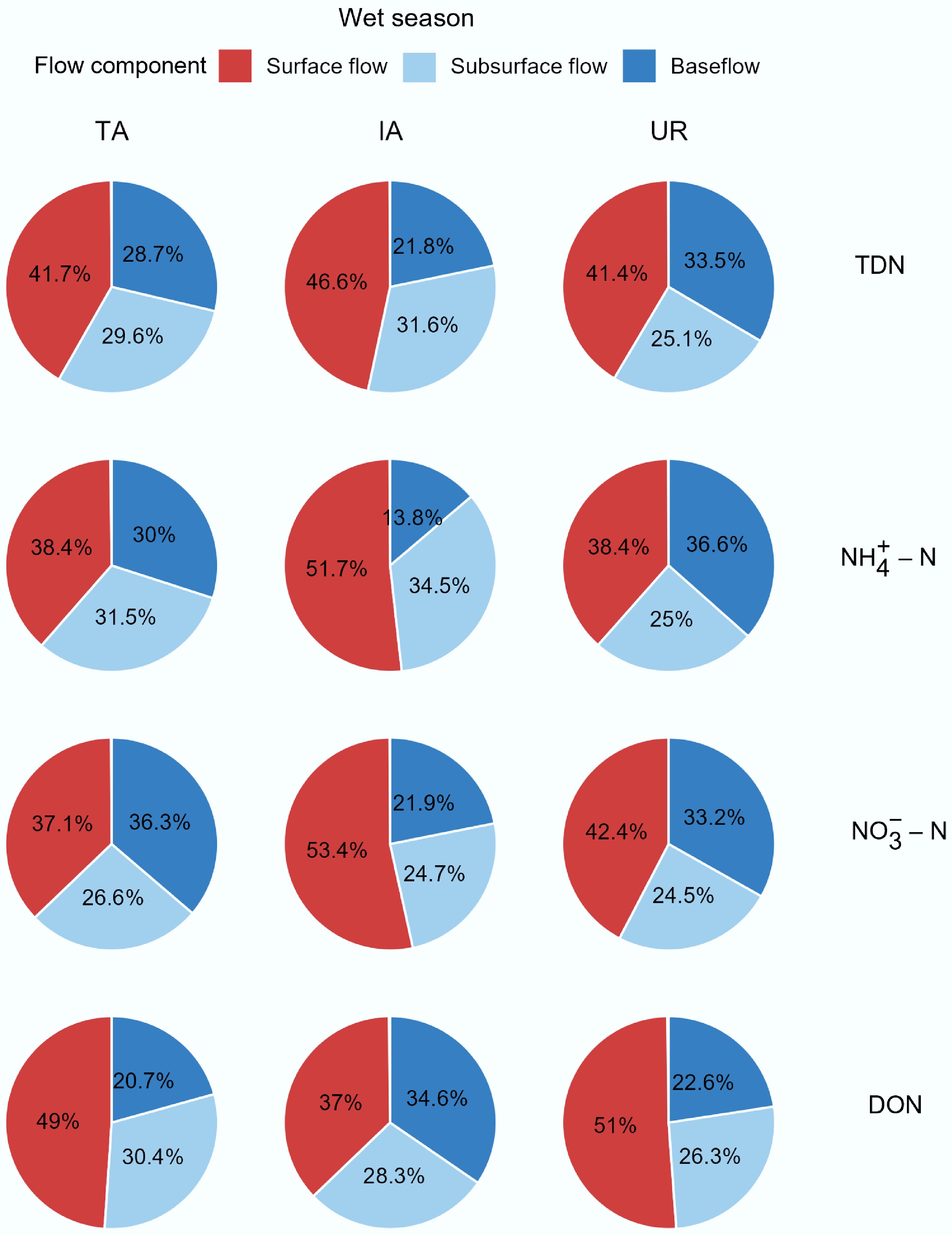This seasonal load reversal is tightly coupled with the dramatic shifts in hydrological transport pathways (Figs 5 and 6). During the dry season, N export in all watersheds was dominated by baseflow, which accounted for 58.7%, 38.8%, and 49.2% of the TDN loads in the TA, IA, and UR watersheds, respectively. Upon transitioning to the wet season, the transport mechanism fundamentally changed as surface runoff volumes surged. Baseflow contributions generally decreased, while surface runoff contributions rose sharply, becoming the primary pathway for TDN export in the TA and IA watersheds during the wet season (contributing 41.7% and 46.6%, respectively). This seasonal pathway switching varied among N species. The baseflow contribution to NO3−−N in the TA watershed dropped from 66.8% in the dry season to 36.3% in the wet season. DON was most sensitive to changes in surface runoff, with its export via this pathway in the UR watershed increasing from 41.6% in the dry season to 51.0% in the wet season. The seasonal pattern in the IA watershed was particularly unique, as its surface runoff maintained a high contribution even during the dry season (38.5% for NH4+-N) and increased further in the wet season (51.7%), suggesting the influence of persistent point sources or high-intensity agricultural sources.