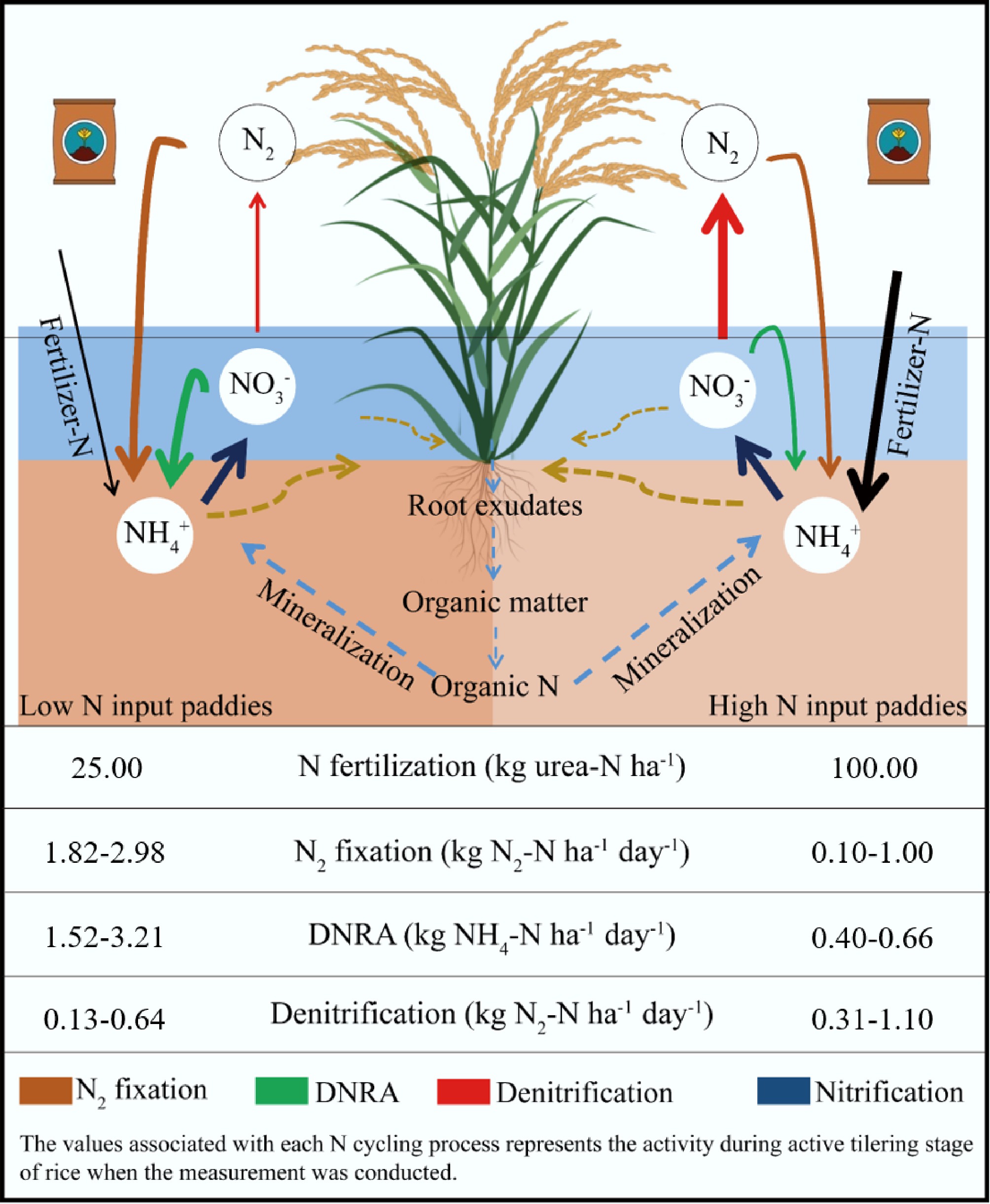 Rates of N inputs and transformations in low and high N-input rice paddies, including N fertilization rate (kg urea: N·ha−1·d−1), N2 fixation rates (kg N2: N·ha−1·d−1), dissimilatory nitrate reduction to ammonium (DNRA) rates (kg NH4: N·ha−1·d−1), and denitrification rates (kg N2: N·ha−1·d−1). The values associated with each N cycling process above represent the activity during the active tillering stage of rice when the measurement was conducted.