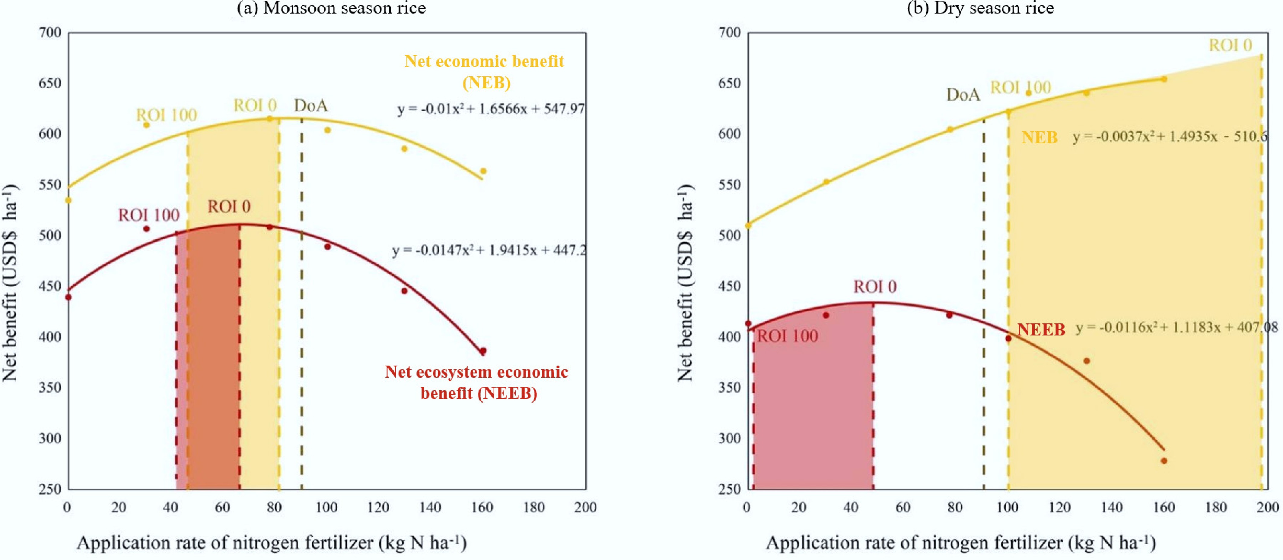 The optimal N application to maximize economic and environmental performance in (a) monsoon and (b) dry seasons for achieving ROI-100 and ROI-0. ROI-100: 100% return on investment; ROI-0: marginal revenue equals marginal cost for additional N fertilizer input.