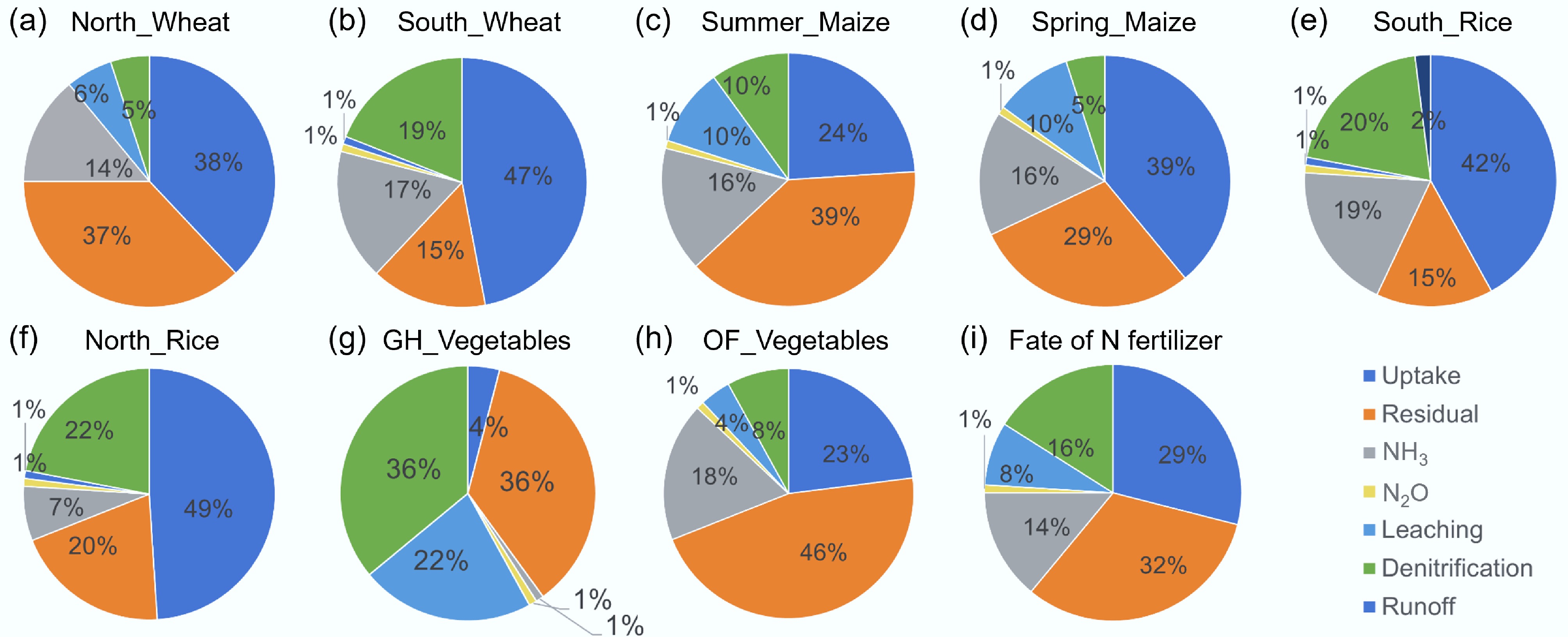 Fate of fertilizer N in different crops. (a) North_Wheat. (b) South_Wheat. (c) Summer_Maize. (d) Spring_Maize. (e) South_Rice. (f) North_Rice. (g) Greenhouse(GH)_Vegetables. (h) Openfield(OF)_Vegetables and the overall fate of N fertilizer in China's crop production (i). Data were summarized from literature and introduced for details in the Material and methods section as well as the supplementary information.