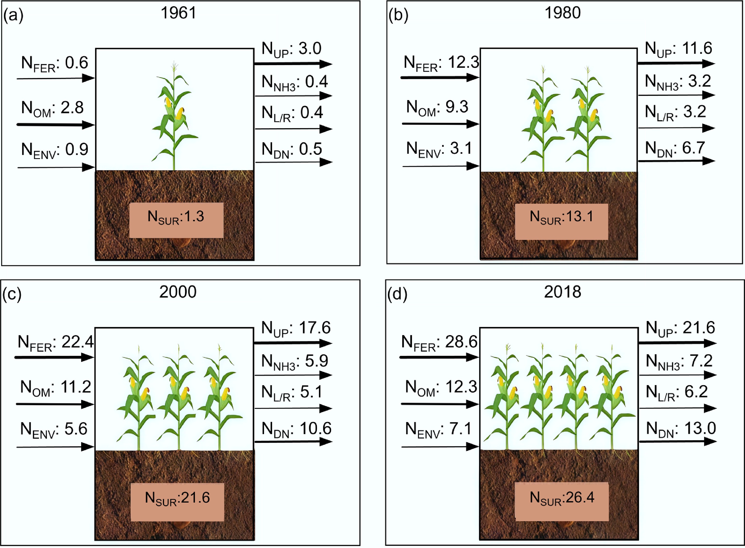 Neglecting small changes in soil N pools over the long term, N input and output budgets in China between 1961 and 2018 were systematically evaluated. The N surplus (NSUR) was calculated as the difference between N input and N uptake (NUP) by harvested crops: