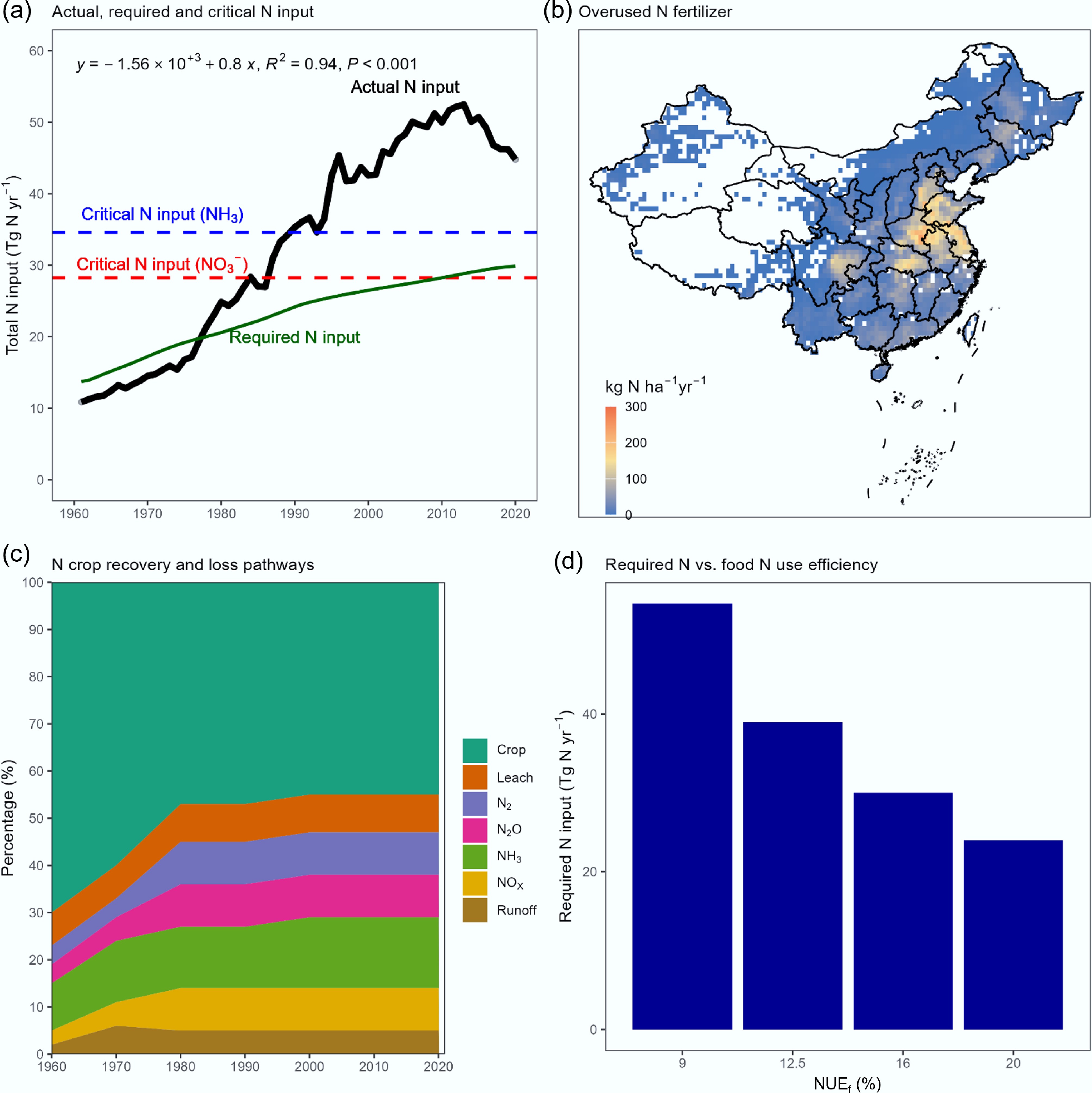 Actual, required and critical N inputs. (a) Annual changes in actual, required and critical N inputs. The required N input to cropland is calculated based on the human requirement for daily protein intake and N use efficiency in the food chain. (b) The spatial distribution of fertilizer N overuse for 16 major crops in China. (c) The contribution of N output by each pathway in China between 1961 and 2018. (d) Required N inputs under different food N use efficiency levels in China.
