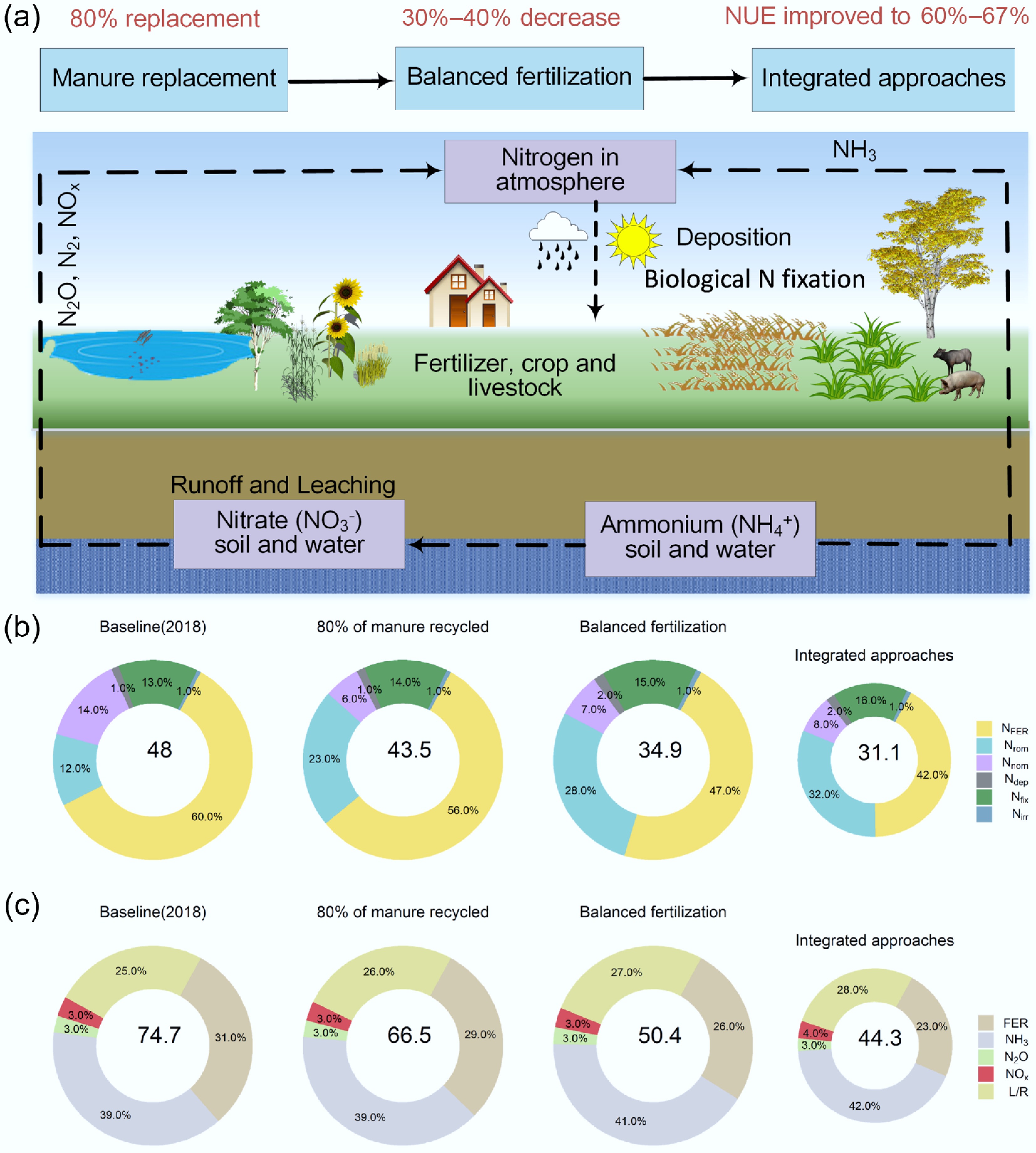 The intensifying demand for food security in China, driven by population growth and dietary shifts, necessitates sustainable intensification of agricultural systems. While the 'Zero Increase Action Plan' (2015) has curbed chemical N fertilizer use[24], its reliance on partial NUE improvements overlooks the critical knowledge gap in harmonizing fertilizer and manure systems. Zhang et al.[7] projected a 2050 N demand of 27 Tg N yr−1 for China under 60% NUE, but their framework ignored manure's role in closing yield gaps while mitigating N losses. The present analysis quantifies, for the first time, the dual thresholds of N inputs for food production and critical N loss limits (e.g., NH3 volatilization and nitrate N leaching), revealing that current practices are fall shorts of these benchmarks. By establishing an integrated framework, policy blueprints are derived that reduce fertilizer dependency and increase organic manure recycling while sustaining yields—a prerequisite for aligning China's agricultural targets with the Sustainable Development Goals (SDGs). However, no distinction was made between fertilizer and manure inputs, and incomplete manure recycling was not considered. Insight into combined fertilizer and manure management is crucial for assessing required changes in agricultural practices at the national scale. To this end, the necessary N inputs required to meet food production demands in China were first evaluated, comparing these requirements against critical N inputs and critical N loss thresholds to minimize environmental pollution. Variations in N source types were further distinguished, and historical trends in N inputs and losses spanning 1961−2018 were analyzed. Building on this analysis, actionable strategies for fertilizer and manure management were identified that could simultaneously fulfil food production targets and environmental protection goals, and the associated costs and benefits quantified.