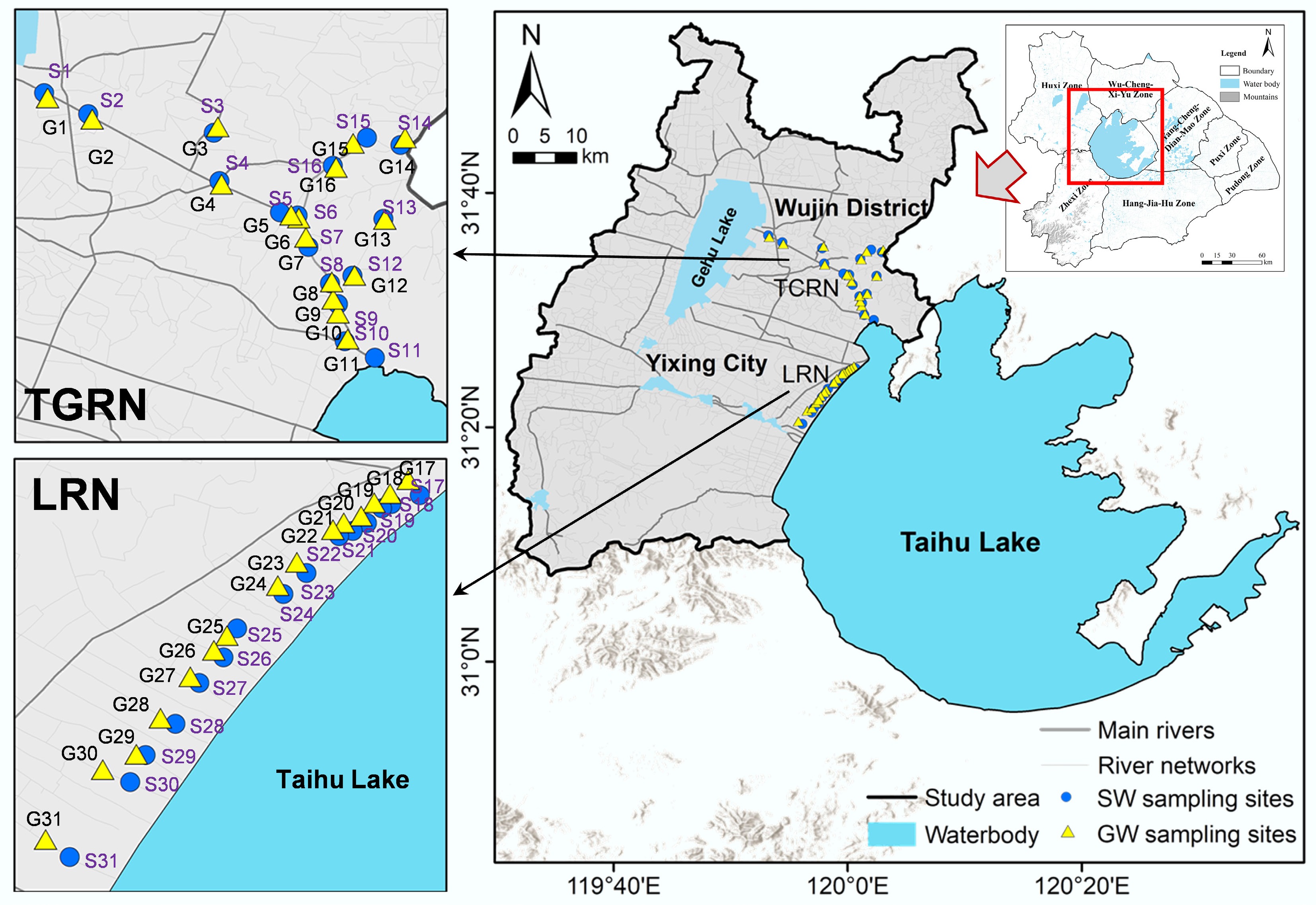 • The rural-urban ecotone of north-western Taihu Lake is a typical inflow area with a mixed agricultural and urban landscape (Fig. 1). Two areas in different counties of China, i.e., Wujin District (WJ), and Yixing City (YX), were targeted for research. The boundary between urban and rural is unclear in WJ. It is a well-developed agricultural area with flourishing commercial agriculture, i.e., vegetables, fruits, and aquaculture ponds. WJ is a hybridized area containing industrialized, populated, and agricultural areas, known as the Tai-ge Canal River Network (TCRN). YX is a traditional agricultural and residential area named Lakeside River Network (LRN). Seasonal surface water collections were conducted in different areas in December 2021 (dry season), August 2023 (wet season), and June 2025 (regular flow season). At the surface water sampling sites, groundwater samples were collected in June 2025. A total of five categories of regional primary typical pollutant samples were collected during sampling, i.e., precipitation, aquaculture effluent, manure, soil, and chemical fertilizer.