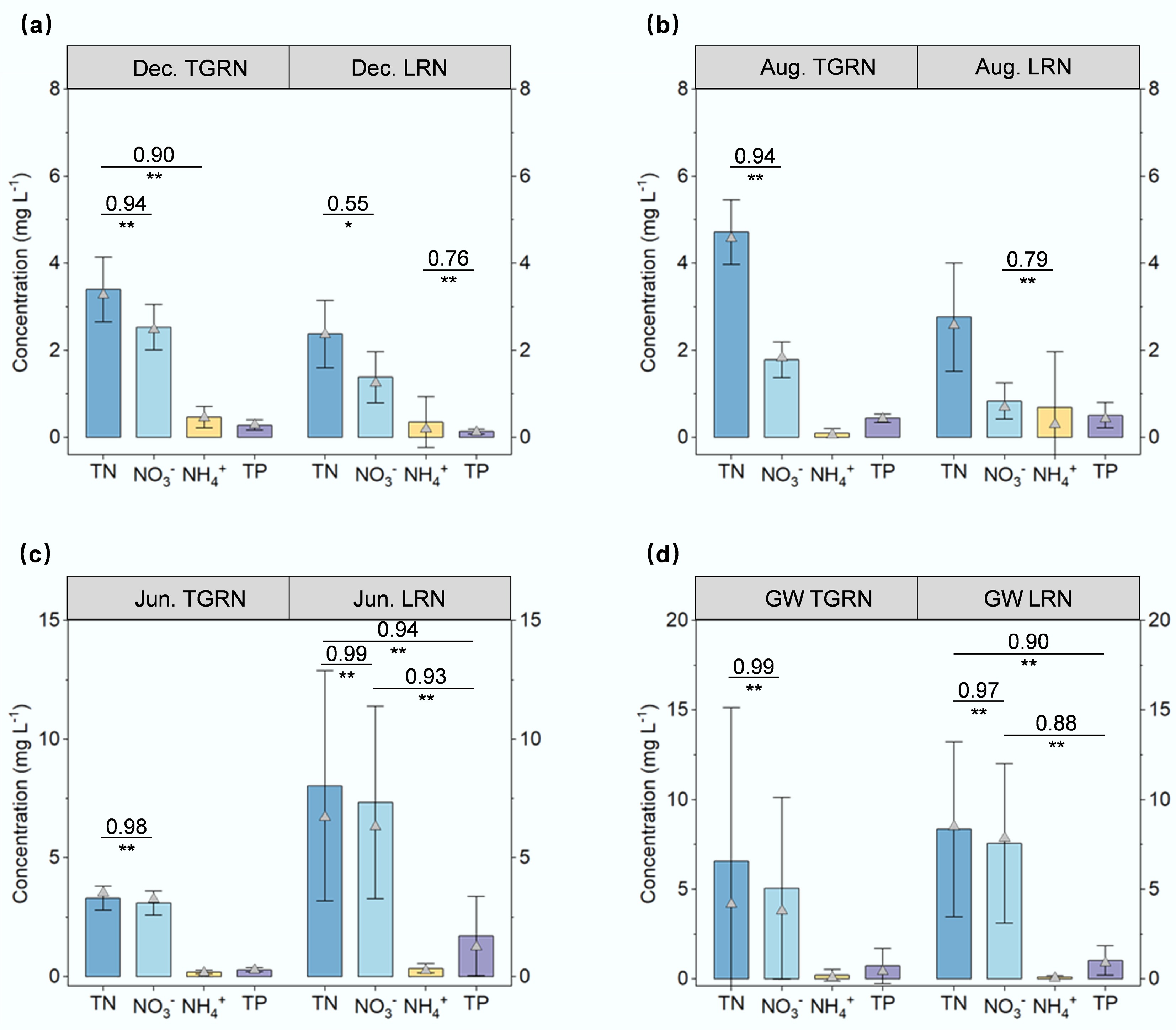 Differences in nutrient concentration of surface water during the (a) dry, (b) wet, and (c) regular flow seasons and groundwater during the regular (d) flow season in the Tai-ge Canal river network area (TGRN), and the lakeside river network (LRN).