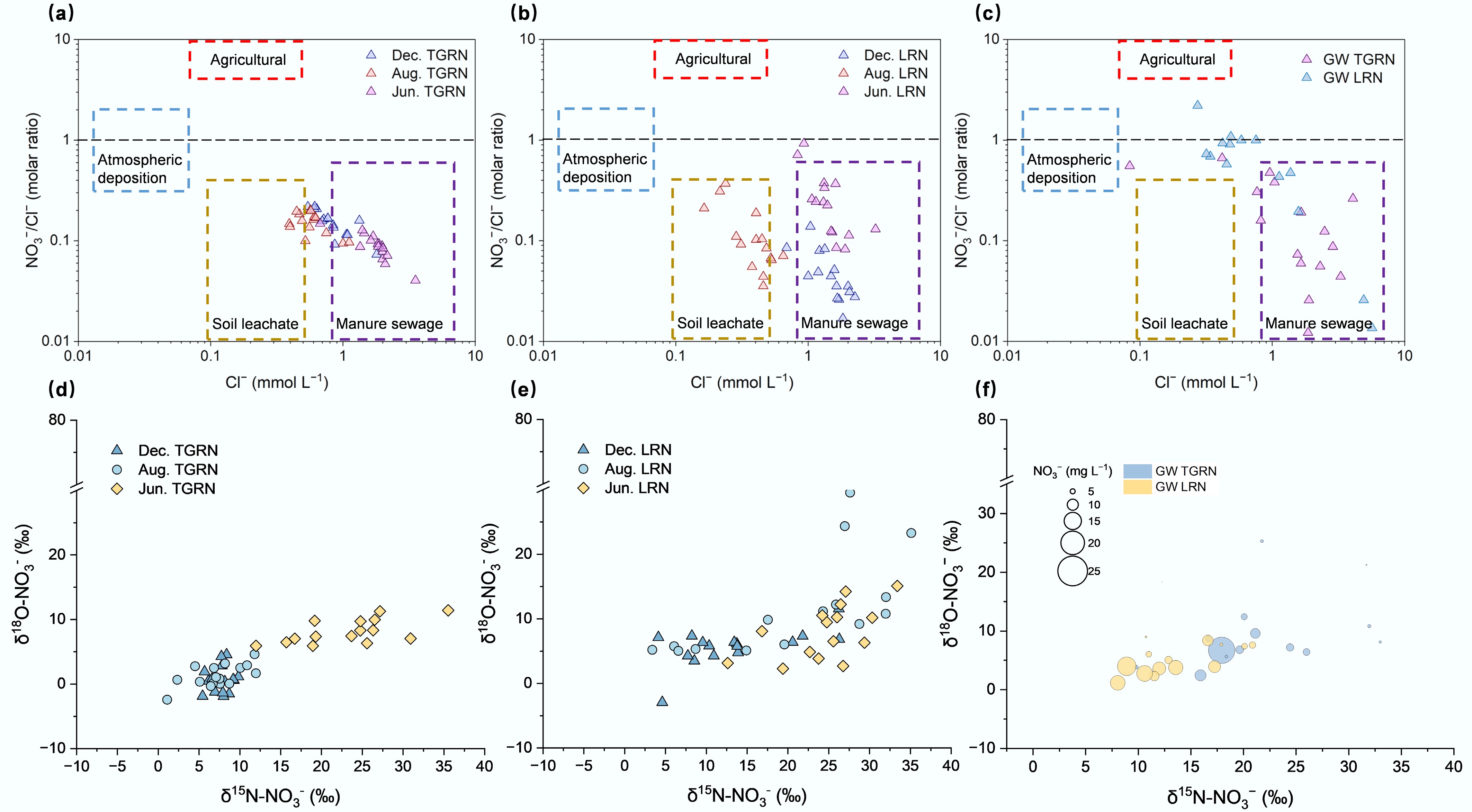 • The combination of hydrogeochemical indicators and dual isotopes allows for better traceability. Cl is a chemical tracer due to its chemical and biological inertness, which can combine with NO3 to identify potential sources of NO3−[30]. Because Cl is affected by dilution and hydrological mixing, the NO3/Cl ratio was applied to distinguish agricultural inputs, soil leachate, and manure and sewage sources (Fig. 3). During the dry season in LRN, the Cl concentration was high (1.51 ± 0.43 mM) and NO3/Cl was low (0.05 ± 0.03), which indicated the potential sources may be the manure. In the wet season, the Cl in LRN (0.40 ± 0.13 mM) and TGRN (0.61 ± 0.20 mM) were relatively low, and the NO3/Cl ratios were low, indicating the increasing contribution of mixing sources. In the regular flow season, isotopic and hydrochemical patterns pointed primarily to manure and sewage inputs.