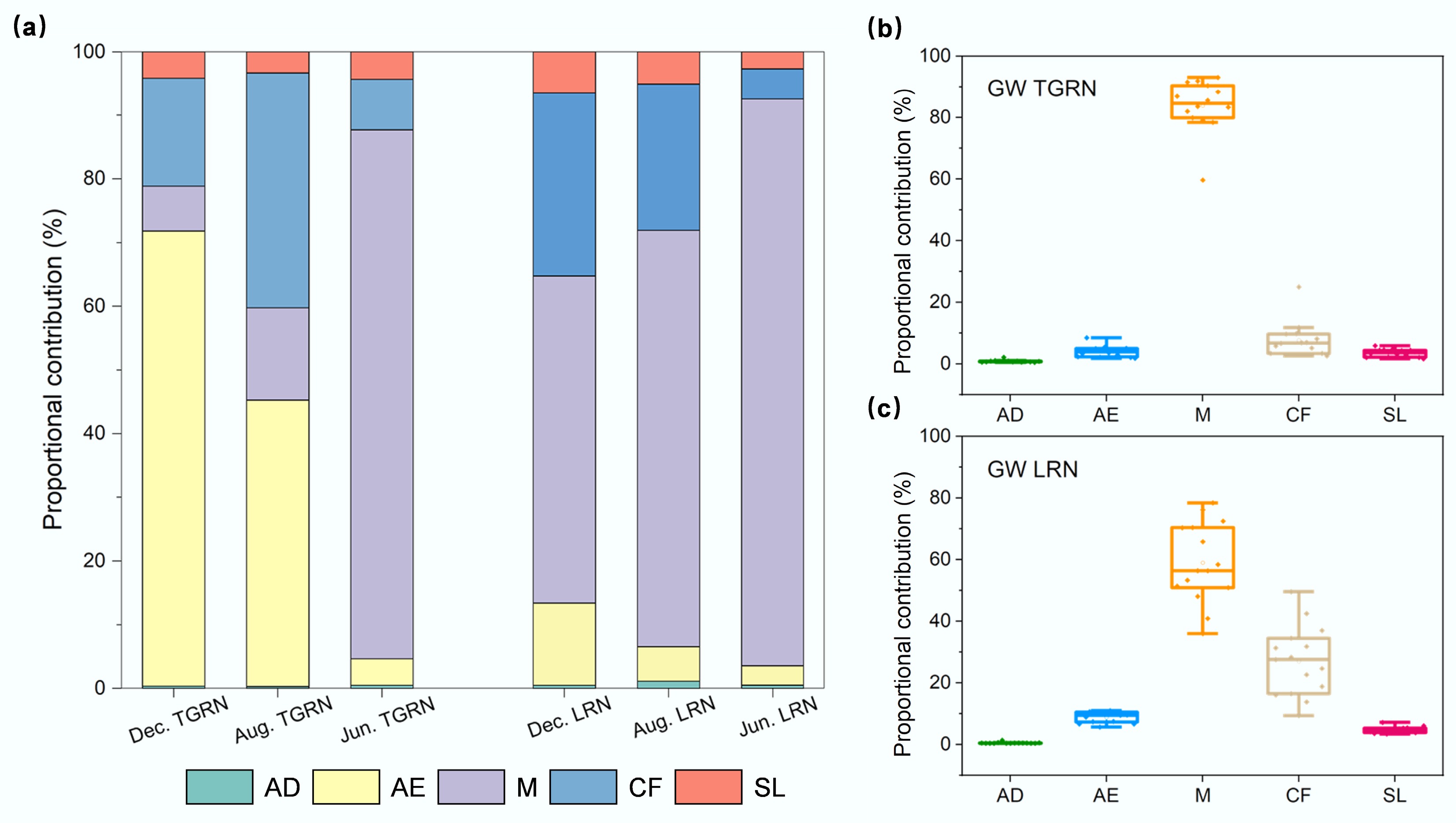 In contrast, the TGRN displayed a different seasonal structure of NO3 sources, with contributions ranked as AE > CF > M > SL > AD in dry and wet season (Fig. 4a). During the dry season, AE was the primary source, contributing 71.4% ± 4.2%, followed by CF at 17.0% ± 3.2%. In the wet season, however, the influence of agricultural inputs increased, with CF- and M-derived NO3 rising to 37.0% ± 9.7% and 14.5% ± 4.8%, respectively. Notably, similar to LRN, manure became the dominant source during the regular flow season, contributing 83.0% ± 7.9%. Groundwater in TGRN was also primarily influenced by M (Fig. 4b), accounting for 83.8% ± 8.5%.