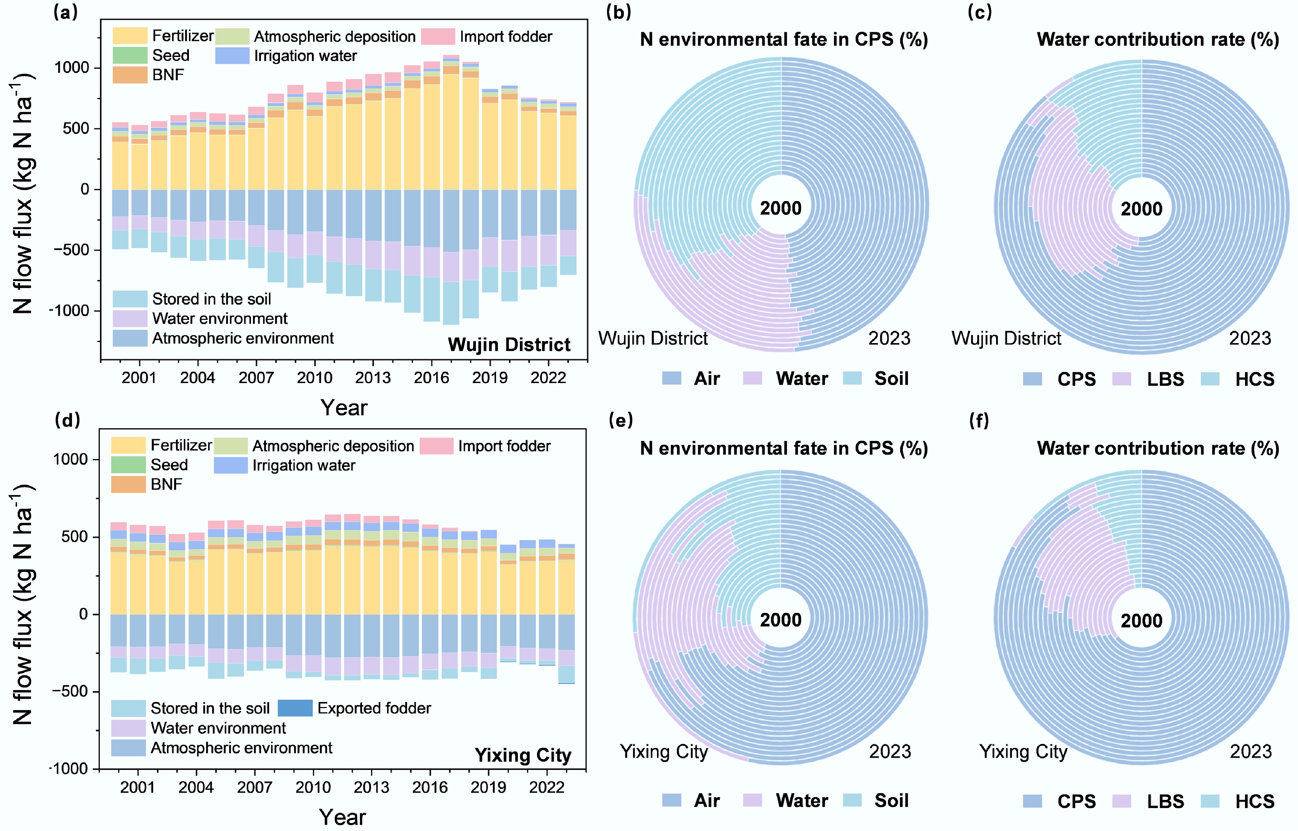 Temporal N flux in the agriculture-food-environment system in (a) Wujin District, and (d) Yixing City from 2000 to 2023. (b), (e) The N environment fate in CPS can be divided into losses to air and water, and storage in soil. (c), (f) The contribution percentage of N loss from crop-production subsystem (CPS), livestock-breeding subsystem (LBS), and household-consumption subsystem (HCS) subsystems to the water environment during the period 2000–2023.