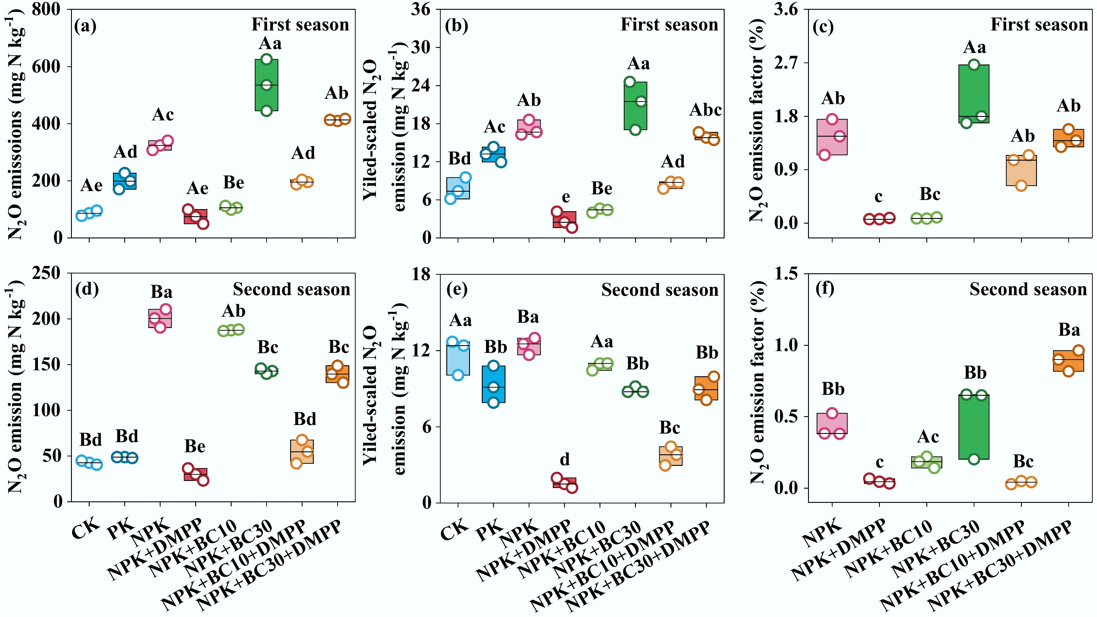 Fertilization treatments, growing seasons, and their interactions significantly affected soil N2O emissions, yield-scaled N2O emissions, and N2O emission factors (Fig. 2; Supplementary Fig. S2). Overall, NPK + DMPP, NPK + BC10, and NPK + BC10 + DMPP significantly decreased soil N2O emissions across both seasons, with the strongest mitigation observed under NPK + DMPP. In contrast, NPK + BC30 and NPK + BC30 + DMPP significantly reduced N2O emissions only in the second season. N2O emissions under NPK + BC10 were significantly reduced relative to NPK + BC30 in the first season, whereas the opposite trend was observed in the second season. Similarly, N2O emissions under NPK + BC10 + DMPP were significantly lower than those under NPK + BC30 + DMPP across both seasons. Both NPK + DMPP and NPK + BC10 + DMPP significantly reduced yield-scaled N2O emissions in both seasons, with NPK + DMPP showing the greatest reduction. Furthermore, both NPK + DMPP and NPK + BC10 significantly decreased N2O emission factors in both seasons.