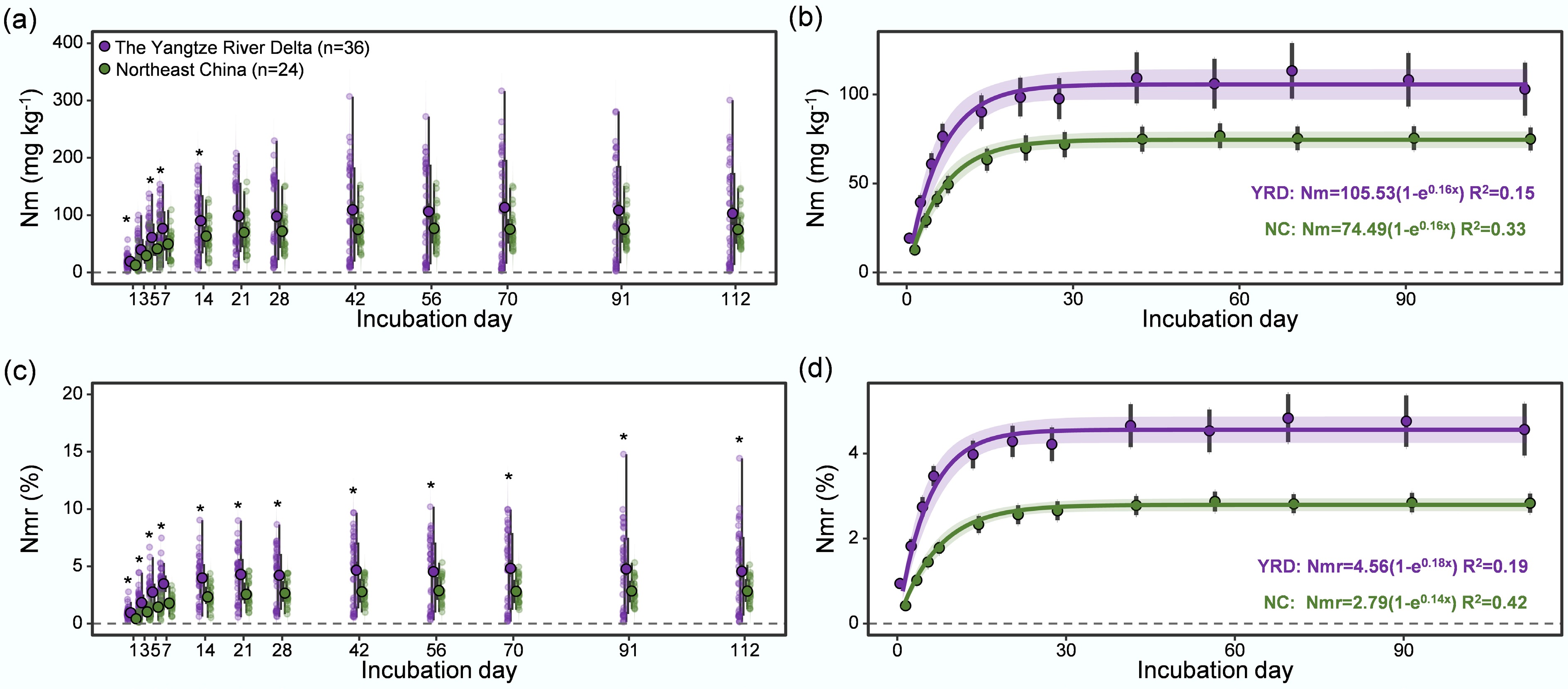 (a) Nitrogen mineralization (Nm), (c) nitrogen mineralization ratio (Nmr), and One-pool model for average (b) Nm, and (d) Nmr during a 112-d anaerobic incubation at 30 °C under soil samples from the Yangtze River Delta (YRD), and Northeast China (NC). Nm represents the amount of cumulative mineralized NH4+-N. Nmr represents the ratio of the amount of cumulative mineralized NH4+-N to the total soil nitrogen content (TON). The purple and green solid circles represent the means for 36 and 24 samples in the YRD and NC, respectively. N, sample size. * Significant difference between two regions (p < 0.05).