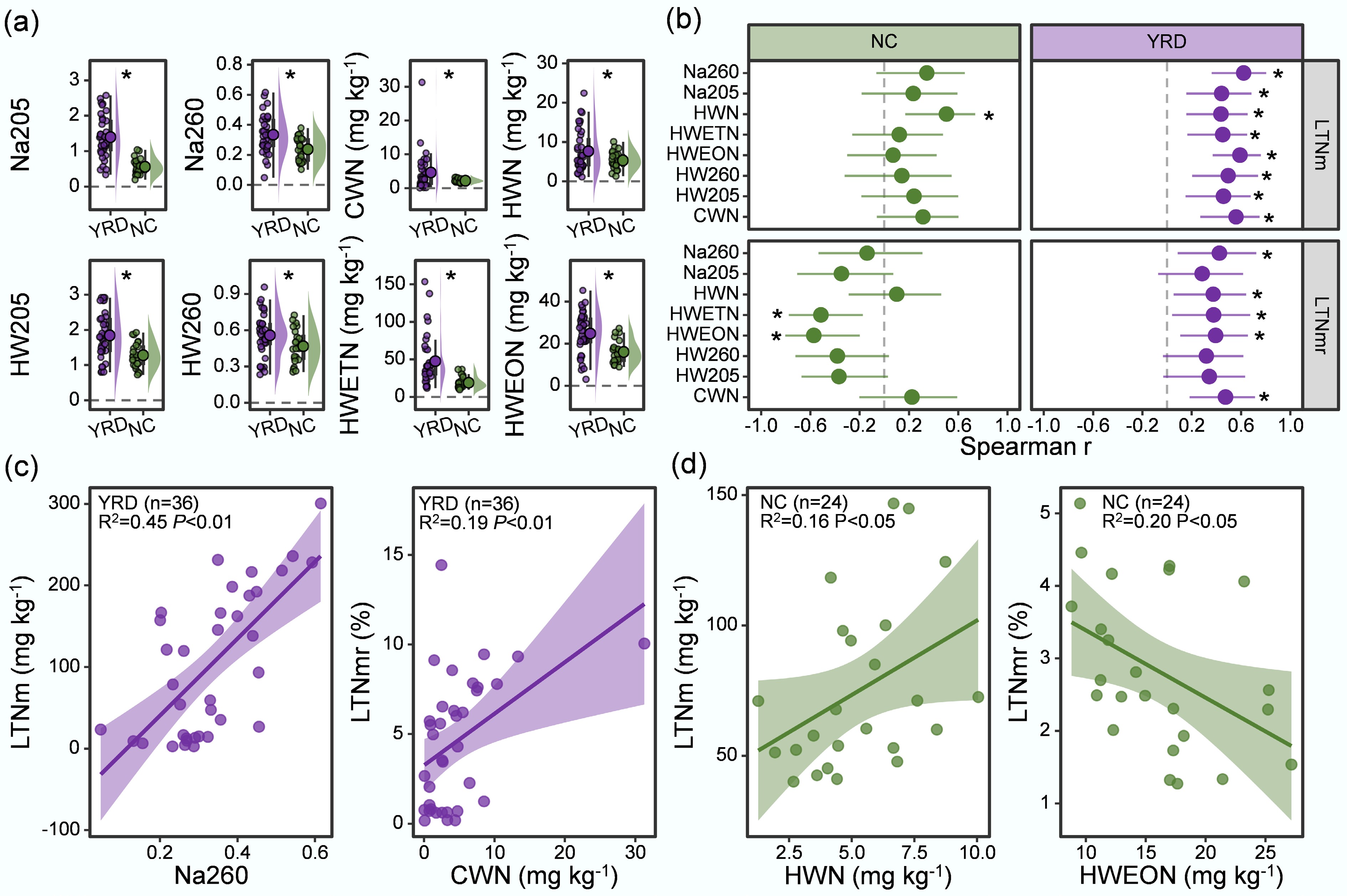Rapid extraction indices showed significant correlations with LTNm in both regions, but differed in their dominant predictors (Fig. 3b). In the YRD soils, Na260 showed the strongest correlation with LTNm (Spearman r = 0.62). In contrast, for the NC soils, the NH4+-N extracted using hot water was significantly (p < 0.05) correlated with LTNm (r of 0.75, Fig. 3b). Overall, the rapid extraction indices displayed stronger associations with LTNm in the YRD soils than in the NC soils. Similarly, the patterns for the LTNmr differed between the two typical soil groups. In the YRD soils, CWN showed the best correlation with LTNmr (r = 0.47), whereas in the NC soils, the HWEON was the most effective predictor (r = 0.57; Fig. 3b).